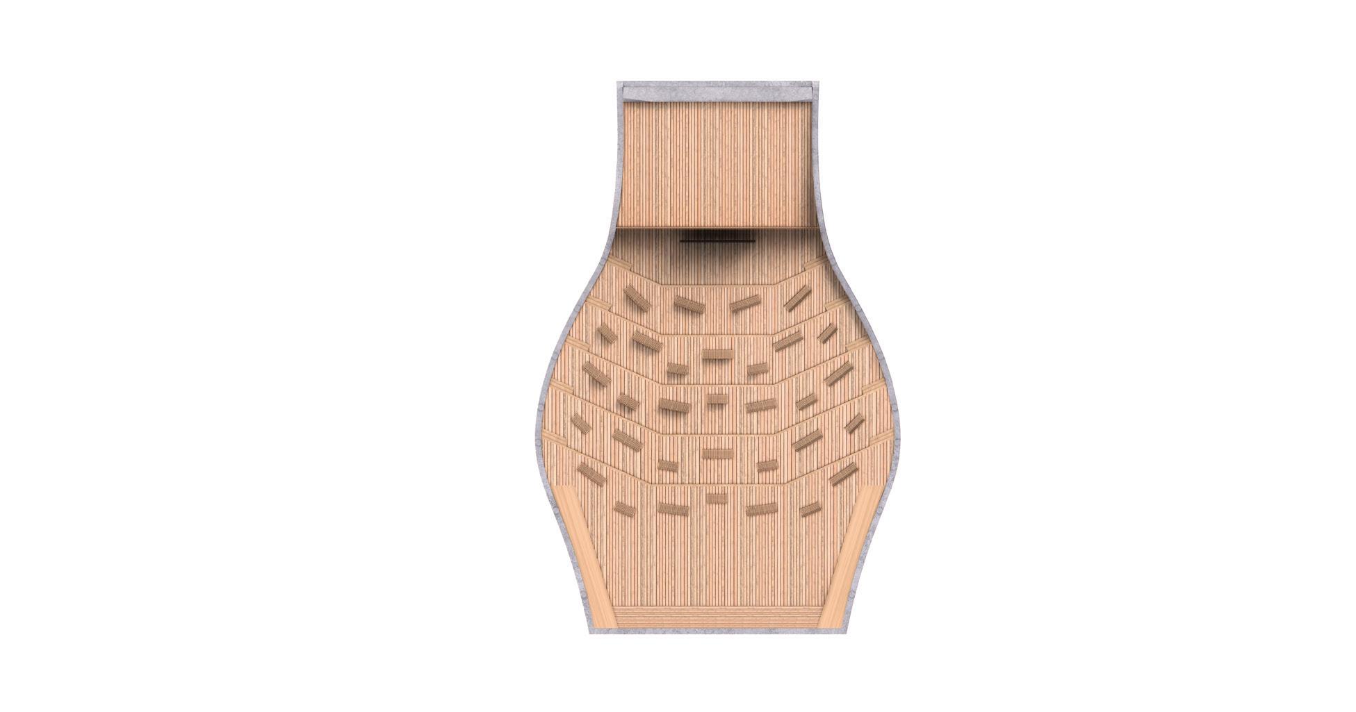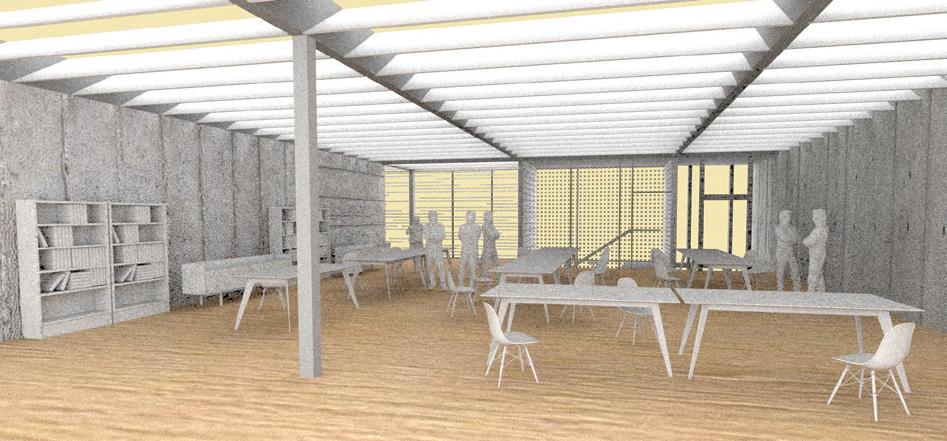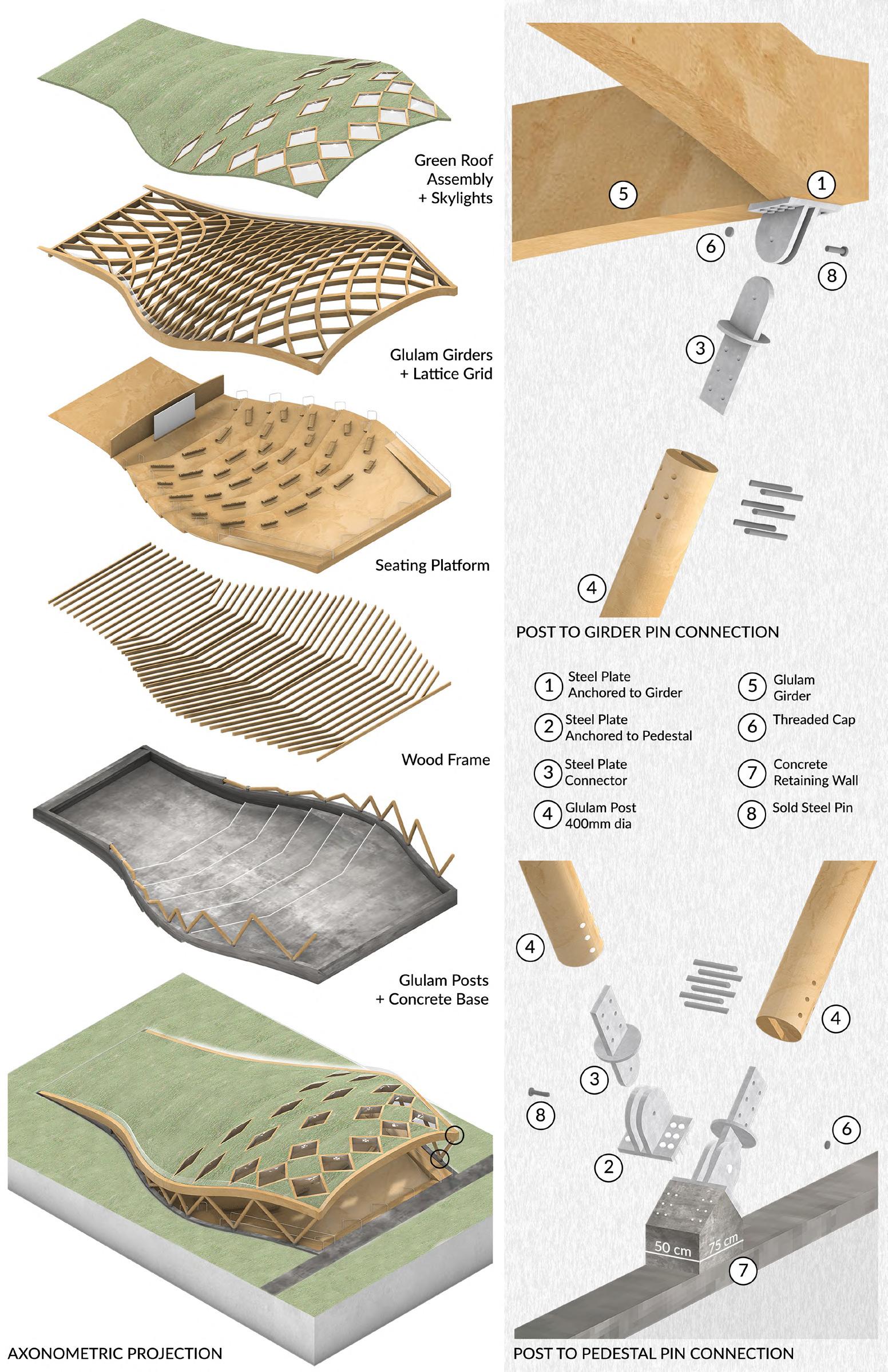 The first typologies consist of dome shaped structures enclosed with recycled glass. They are located on the flood protected plane, and their form maximizes enclosure and daylight while minimizing material use through a ring shaped perimeter timber beam, and using a locally sourced wooden frame.