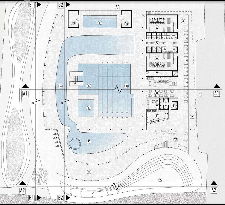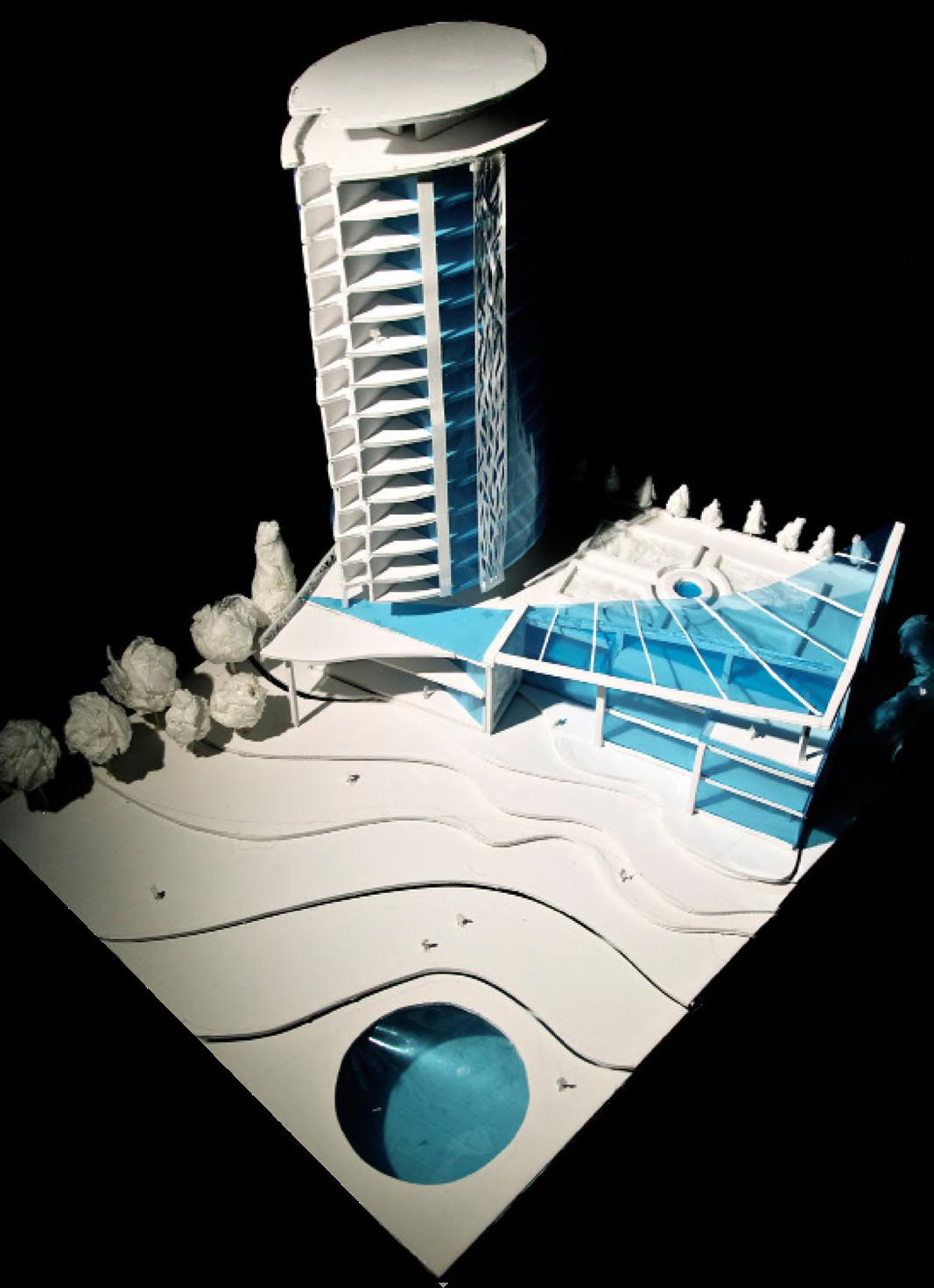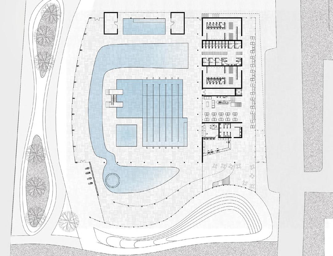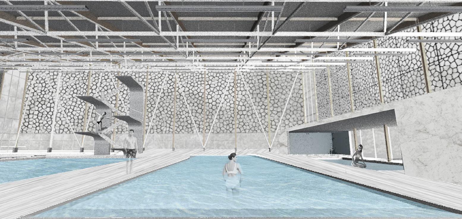 Under the building’s shell, a vast publicly shared area enables guests to come together to bathe, swim, dive, exercise, race, and play.
