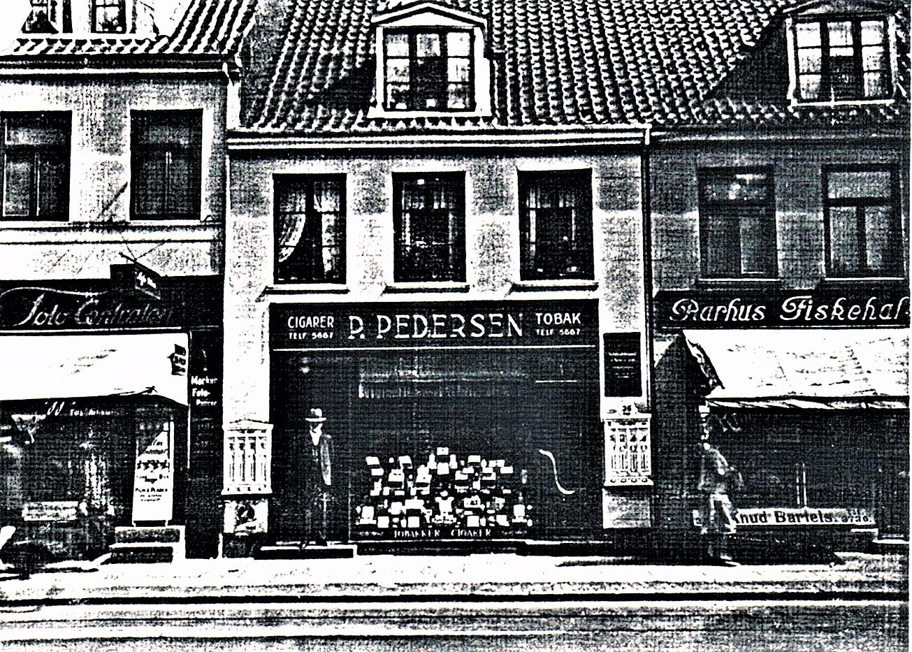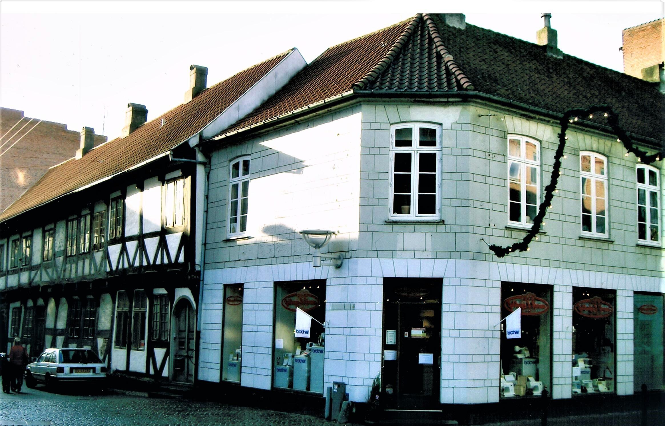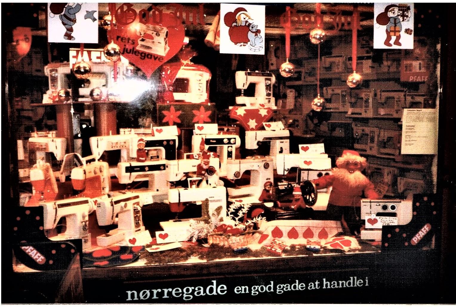 Her varhanså tilkrigen begyndte ogman ikkekunne få nye maskiner mere. Jeg kan tydeligt huske forretningen. Der var en helt speciel lugt i butikken af nye symaskiner, der havde været pakket ind i trækasser med træuld og i lyserødt oliepapir. Jeg kan næsten lugte det endnu. I 1939 var juleudstillingen bl.a. et tog lavet af kraftigt karton med et lokomotiv og to brune godsvogne, hvorpå der stod Pfaff. Det var hele tyve centimeter højt og med hjul der kunne dreje rundt. Det var kommet fra Pfaff fabrikken i Tyskland. - Man ville vise, at der trods krigstrusler stadig kørte tog ud med symaskiner. - Jeg ville gerne have det, når det efter jul skulle tages ud af vinduet igen. Men Buchreitz, der ejede firmaet, havde selv en søn, der var et par år ældre end mig, og han havde fået lovning på toget, men min far fik heldigvis lov tilatgivemigdenenevogn. I denne hjørneejendom i Houmeden 17, lå Pfaff symaskineforretningen i 1938. Her startede min far med at være agent. Indehaveren dengang hed Buchreitz. I vinduet på højre side, stod det fine lokomotiv med to Pfaff vogne udstillet.