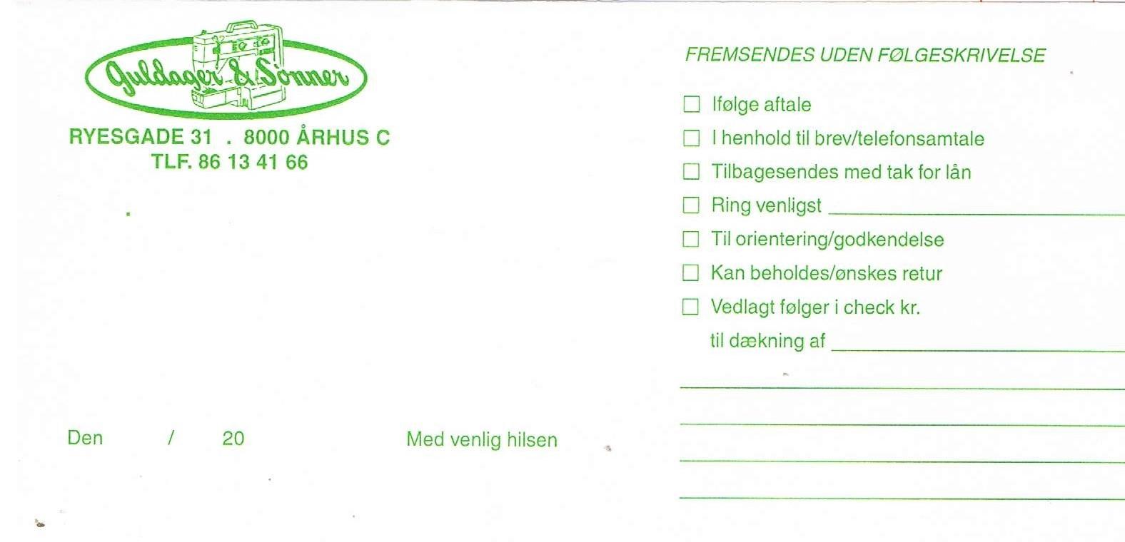 Knud-Erik Guldager: 19351957-1978: Ansat i Nørregade 33, Aarhus. 1978: Overtager firmaet. Det ledes fra Ryesgade 35 1980: Nørregade forretningen lukker. 1984: Flytter firmaet til større lokaler i Ryesgade 31 1995: Overdrager firmaet til Finn Guldager. 1995-2007: Arbejder på deltid under tilbagetrækning. 2008: (1. jan.) Træder helt ud af firmaet.