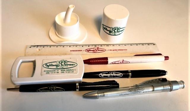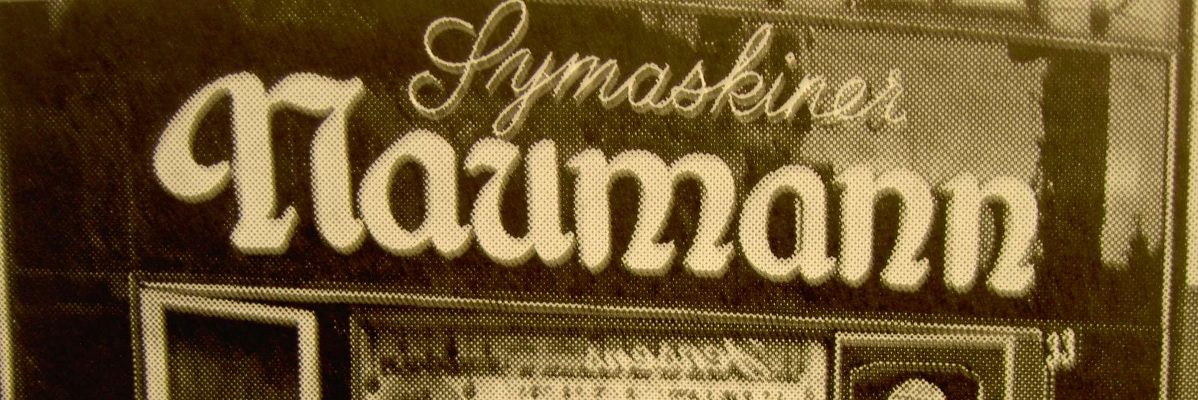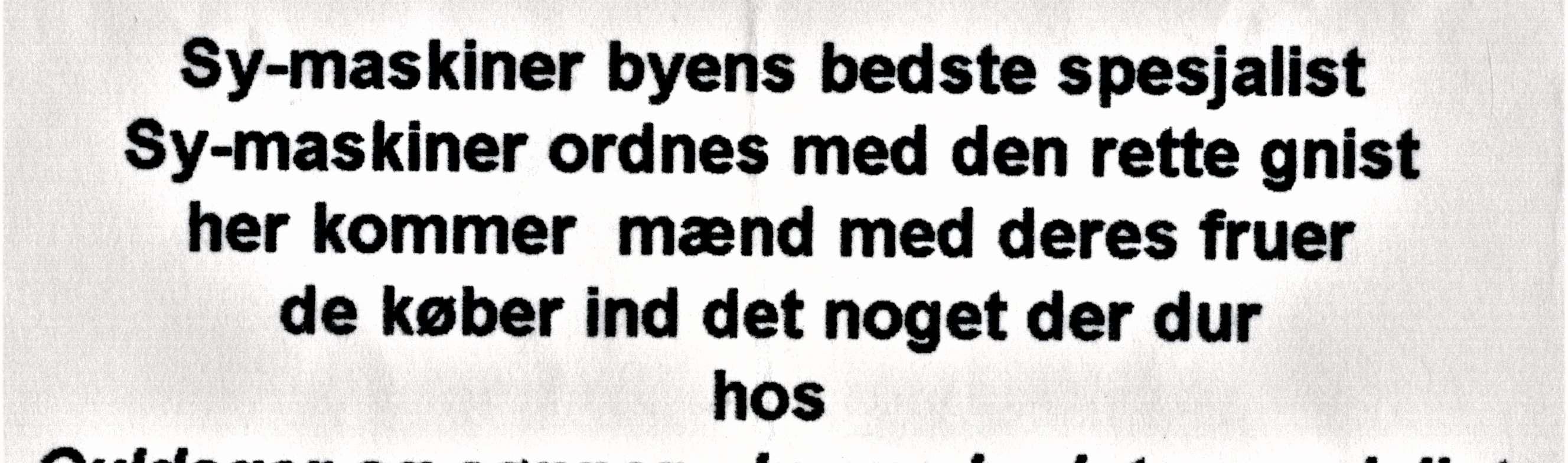 Dette meget flotte emaljeskilt husker jeg tydeligt fra forretningen i Houmeden i Randers. Jeg var imponeret over den måde det var tegnet på. Det er det første jeg kan huske om symaskiner - Se hvor elegant symaskinen går igennem P’et. - Jeg fandt dette skilt, magen til, mange år efter på et loppemarked i Sabro. Måske er det skiltet fra Randers?
