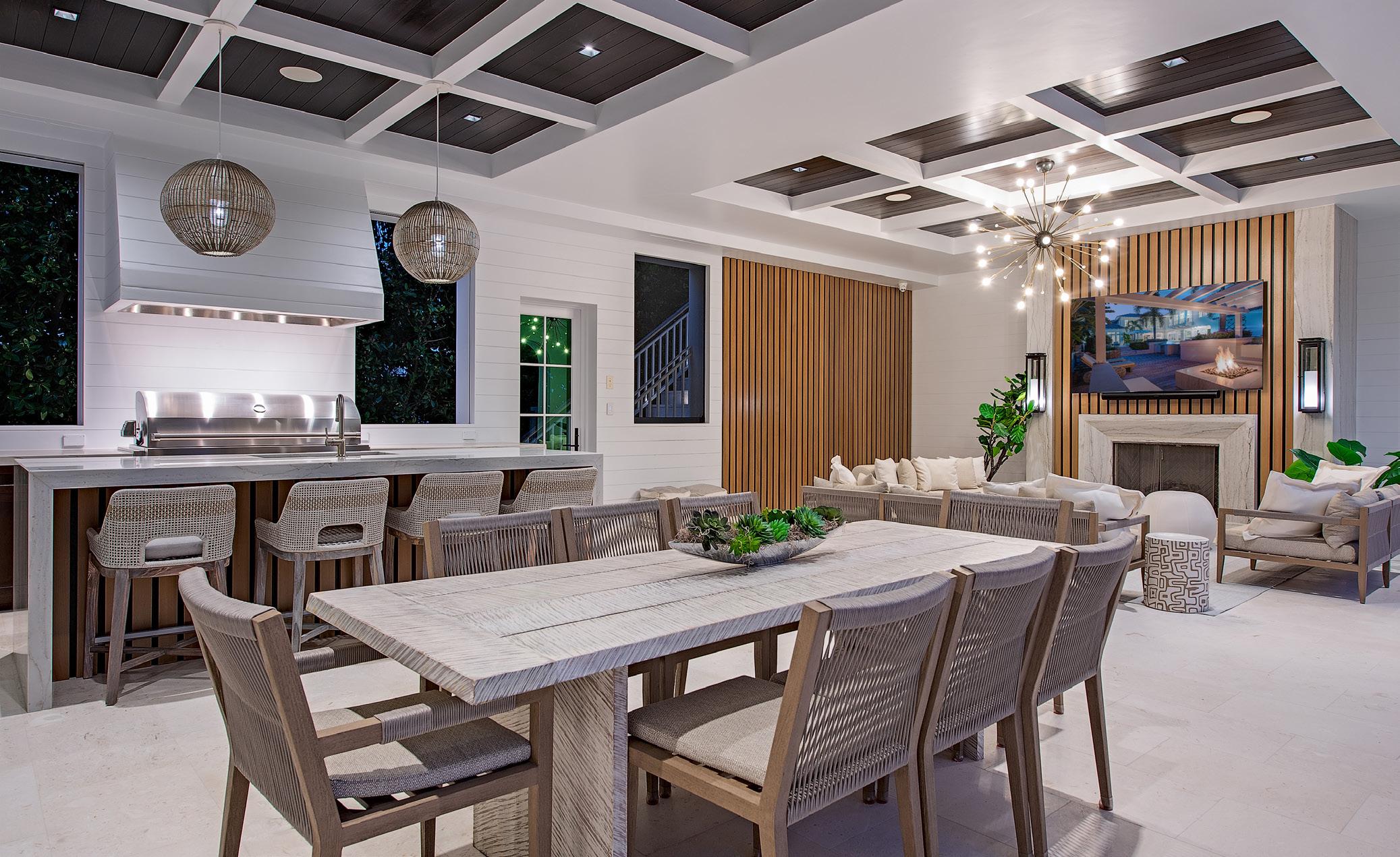 Gourmet kitchen and separate service kitchen feature elite appliances, gas cooking, double ovens, steam oven, and built-in ice maker. Additional features include air-conditioned 4.5-car garage with EV charging, whole-house generator, impact-rated doors and windows, and full concrete construction. Expansive outdoor living area showcases a 65’ resort-style pool with swim-up bar, gas-heated spa, outdoor kitchen with island, fireplace, fire pit, and automated roll-down screens and shutters. Offered furnished and built for the ultimate luxury lifestyle.