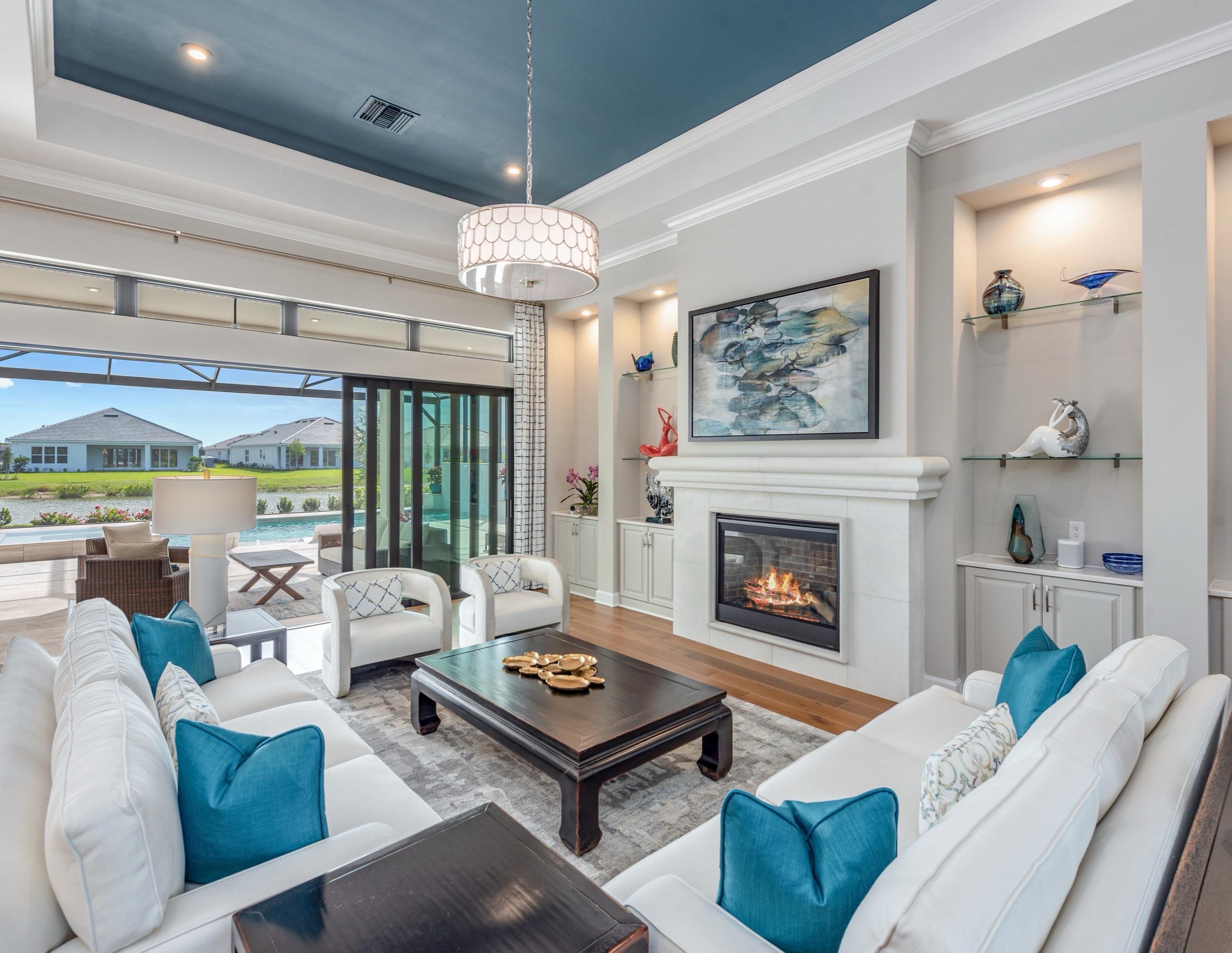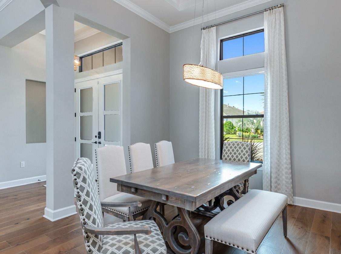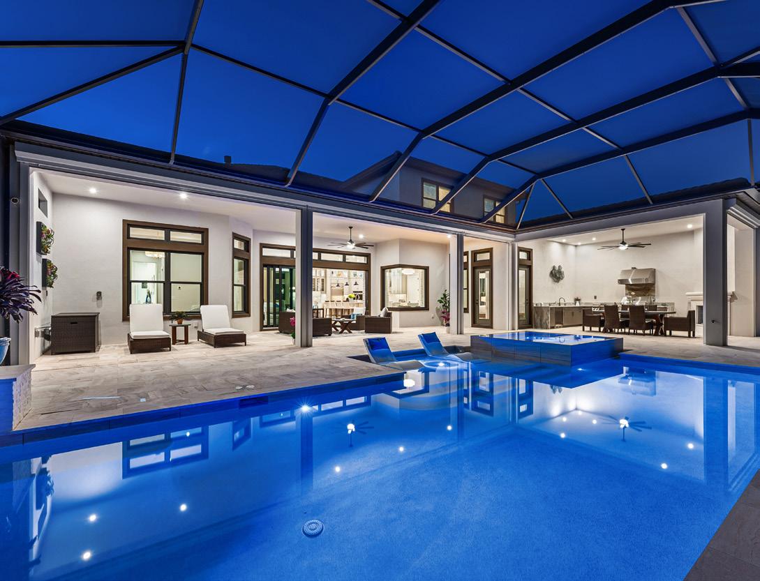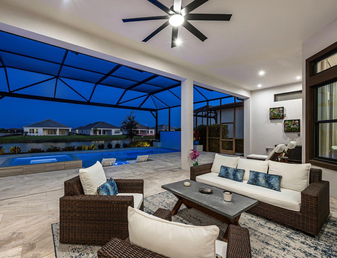 Experience modern luxury and wide-water views from this newly built masterpiece in Esplanade by the Islands. Completed in 2022, this two-story residence was designed to capture lake vistas from nearly every room. Featuring four bedrooms plus a den, four full and two half baths, and a three-car garage, it perfectly blends sophistication, comfort, and functionality. The open-concept living area boasts tray ceilings, designer lighting, and expansive glass sliders that open to a stunning lanai. The gourmet kitchen showcases quartz countertops, Monogram appliances, and a large island ideal for entertaining. The primary suite offers panoramic pool and lake views, dual closets, and a spa-inspired bath, while two guest suites offer en-suite baths, one with pool access. Upstairs, a spacious loft includes a sleek bar and additional guest suite. Outdoor living impresses with a panoramic screen enclosure, Italian marble lanai, a covered seating area, outdoor kitchen, and fireplace. Additional highlights include impact-resistant windows and doors, upgraded landscape lighting, and tankless water heating. Enjoy resort-style amenities: a pool and spa, fitness center, pickleball and tennis courts, salon and spa services, and poolside dining at The Bahama Bar.