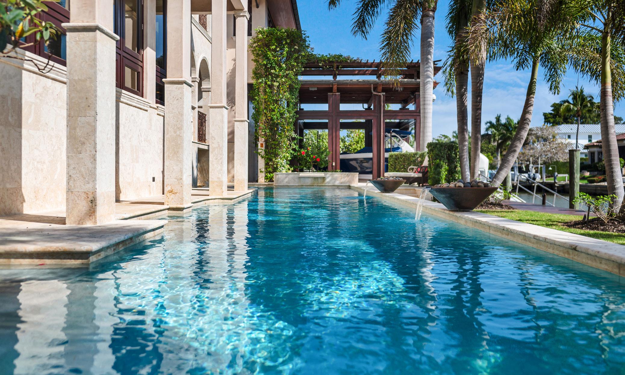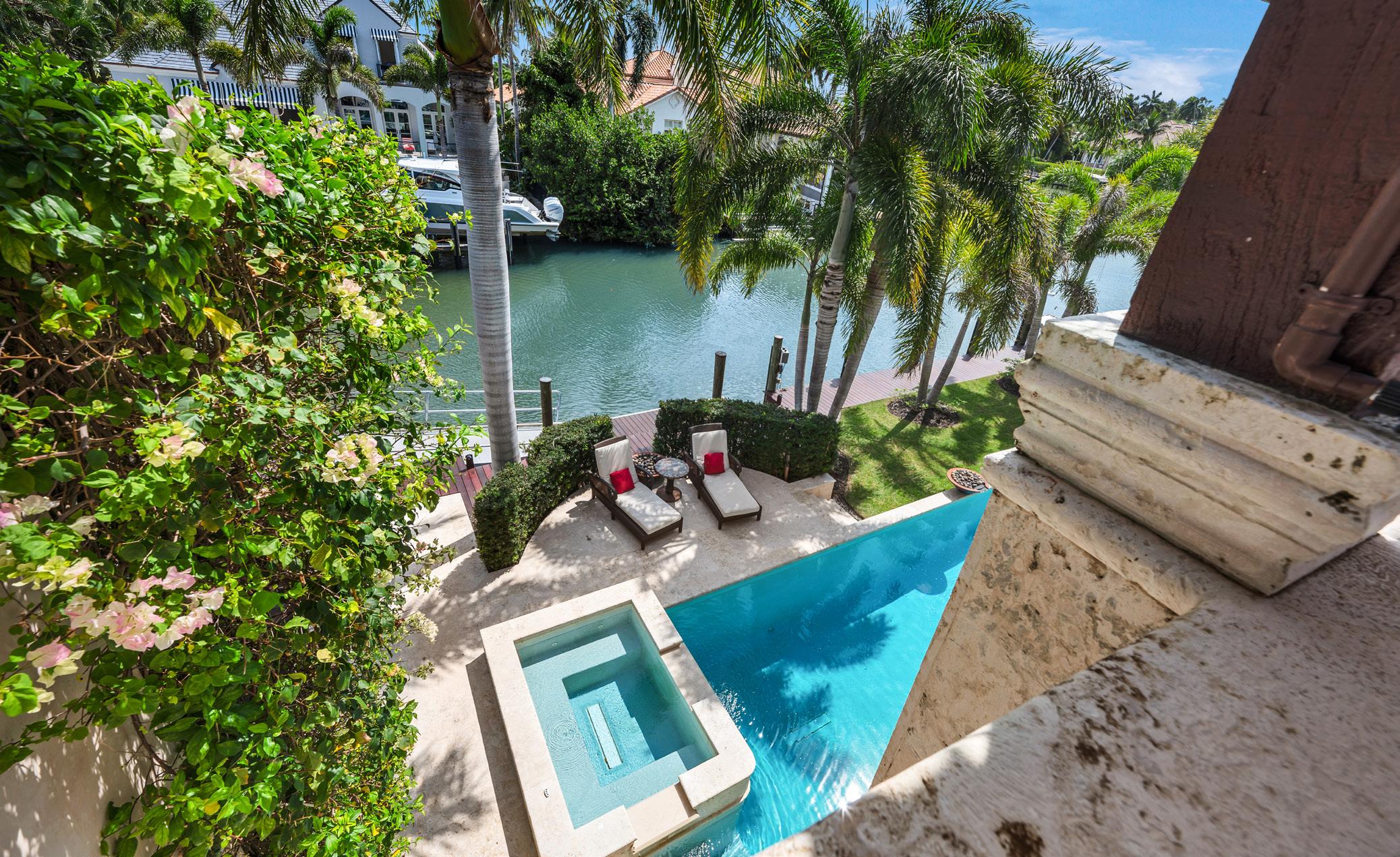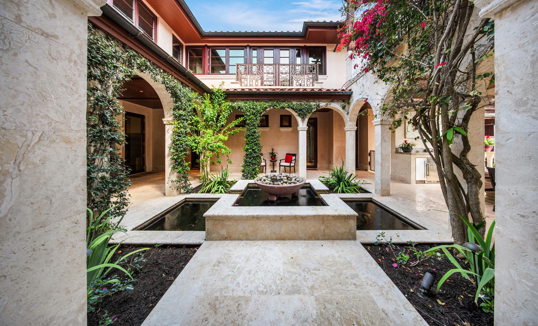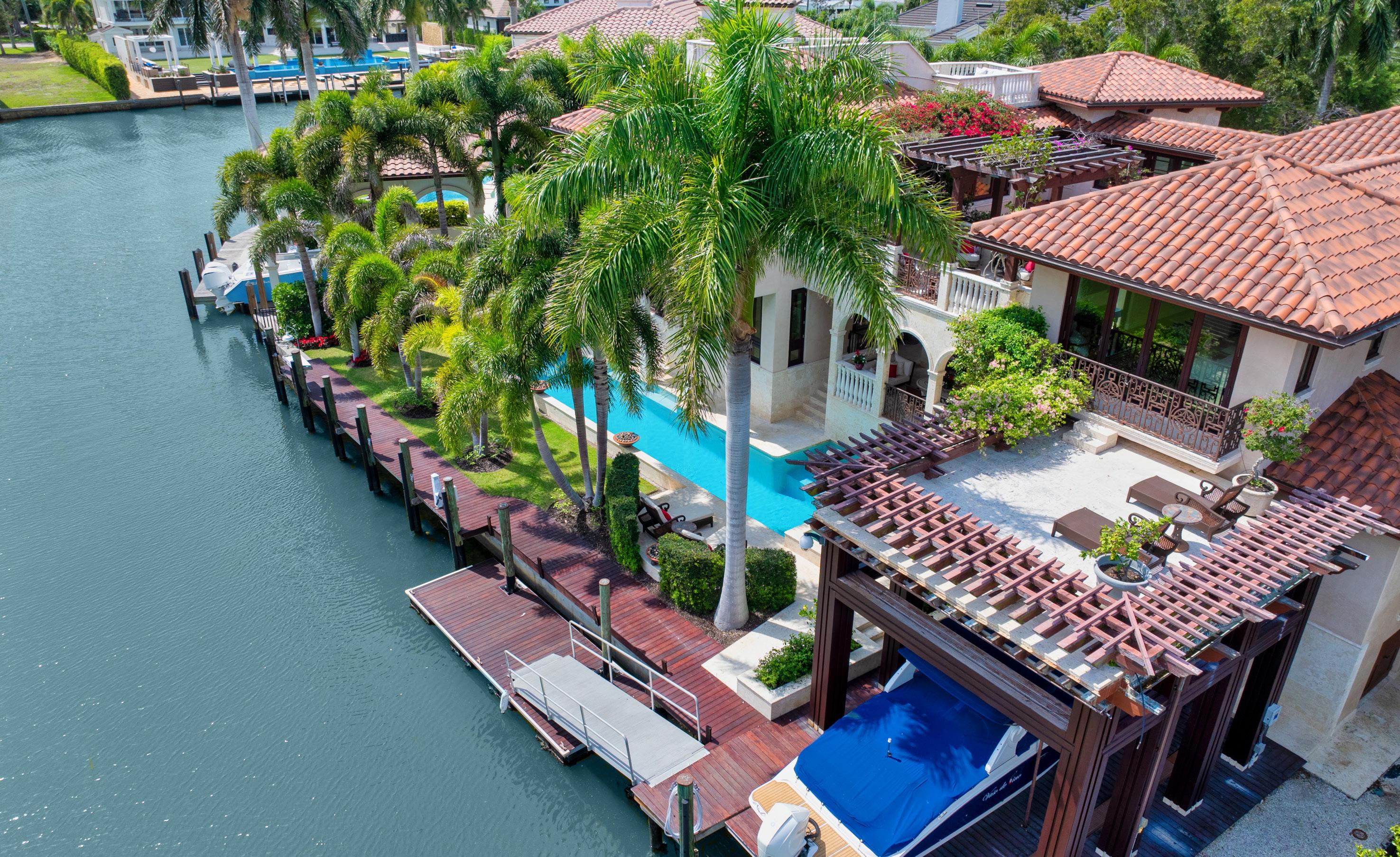 Unparalleled beauty defined in this Asian-Italian inspired courtyard home in Aqualane Shores. Upon entering through an iron gate you are greeted by a flowing water koi pond, exquisite Marmorino venetian plaster walls on the interior and exterior, Luxbaum windows, stone and rosewood floors throughout highlighted by blooming bougainvillea views enjoyed from every angle. Enjoy waterfront living with a 60-foot pool, covered boat slip, and floating dock area; seconds to the bay and direct bridge free access to the Gulf. Ample space for relaxation and entertaining in the large great room dining kitchen area, 5 bedrooms, 5 full baths, and 2 half baths. The second floor holds an additional family room with bar and kitchen area on one side connected by an outdoor terrace sitting area to the master suite on the other. The master bedroom has a private sun terrace, a walk-in closet, a large bathroom with dual marble sinks, soaking tub and steam shower. Experience breathtaking views from the third-level terrace balcony, overlooking Naples Bay and the Gulf of Mexico. Just a 10-minute walk to white sandy beaches, this home offers the ultimate in coastal living. Minutes to 3rd Street South shopping and dining district. This home was designed by Tom Pitchard of Matterlake Designs in NYC and built by Garcia Builders.