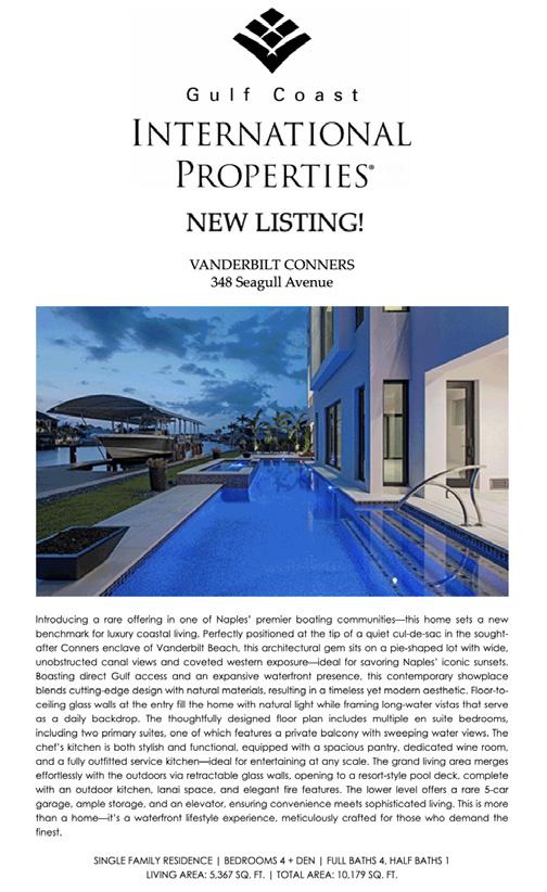 Gulf Coast International Properties ® is a record setting, locally owned and operated luxury real estate firm in Naples. World-class integrated marketing efforts coupled with exceptional customer service has earned us this reputation. As a proven leader in the Naples luxury market, Gulf Coast International Properties ® associates strive to exceed our client’s expectations through uncompromising integrity and unprecedented concierge service. Our award winning multi-generational firm exemplifies the Naples reputation for luxury living. Specializing in exclusive one-of-kind estates, Gulf Coast International Properties ® invites you to experience the difference to Live Exceptionally!