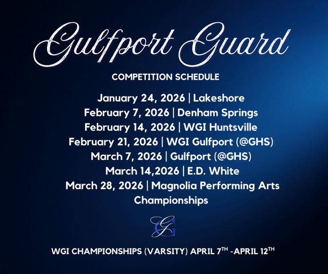 The Gulfport High School Winter Guard season is officially in full swing as they premiered their 2026 programs at their first competition of the year at Lakeshore High School. The Gulfport JV placed 3rd, and the Gulfport Varsity earned 1st place. We are extremely proud of all of our students and their hard work!