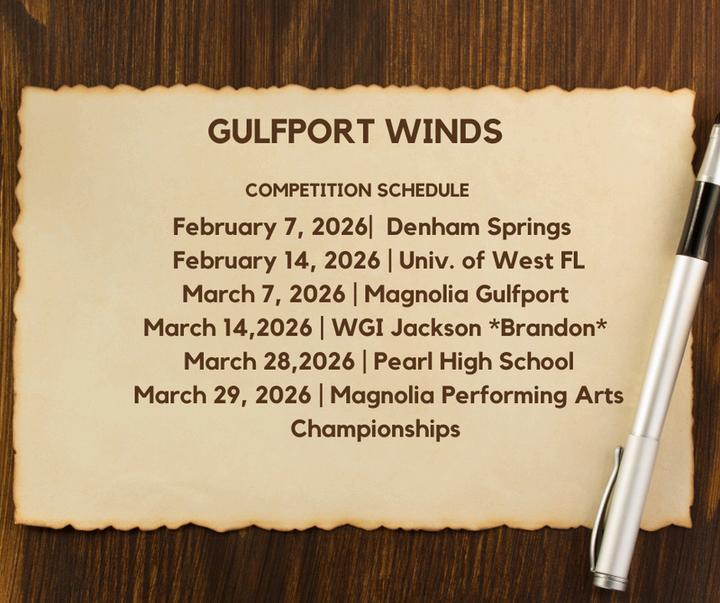 The Gulfport Winter Guard would also like to extend a heartfelt thank you to Mr Huffman and his incredible studentsfor building our props this season for the GHS JV program They worked on a very short timeline and delivered with amazing craftsmanship, creativity, and care Their flexibility, dedication, and willingness to jump in on a tight deadline played a huge role in bringing our show to life, and we are so grateful for their continued support of the arts