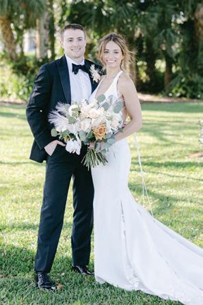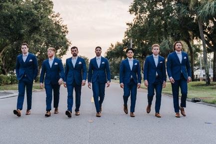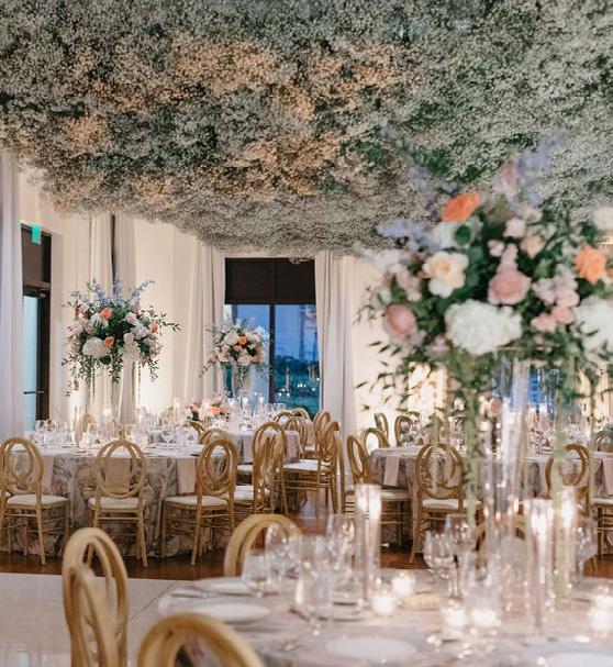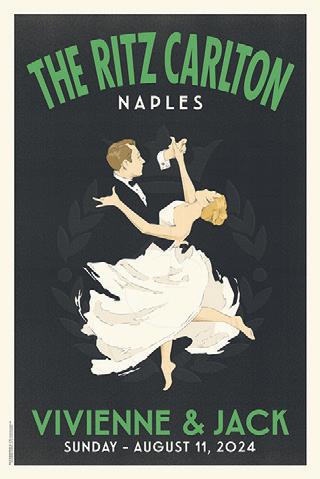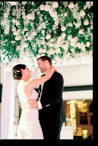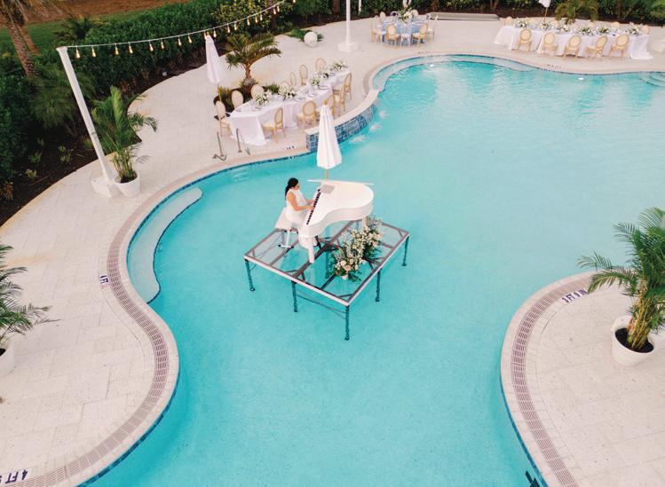 The scene is like a mirage: You step out into a poolside celebration to find a pianist floating on water as she plays tunes by Ed Sheeran and Frank Sinatra. Music fills the air, as the sound waves gently bounce off the water, adding a richer spatial quality to the soundtrack. Everyone is immersed in the moment. Jet Set Wed’s Kehrin Hassan masterminded such a set for a wedding at The Club at Gateway in Fort Myers. The party pro (profiled on p. 22) worked with Naples-based Party Time Rentals and Events to design the steel and acrylic platform. A team of four donned scuba gear to level the nearly 100-pound stage, which Kehrin adorned with blue Canterbury bells and pearly white roses. Pianist Arlen Bermejo, of Jade Strings—the progressive group of classically trained musicians for hire, founded by a pair of Florida Gulf Coast University grads—lit up the stage, with symphonic and pop compositions during the two-hour reception. As the sun set, pin spot lights cast reflections across the cerulean pool, adding to the magic. Now, that’s how you make a splash.