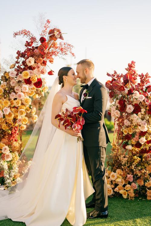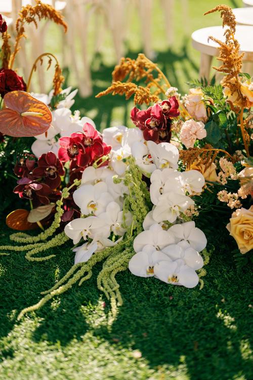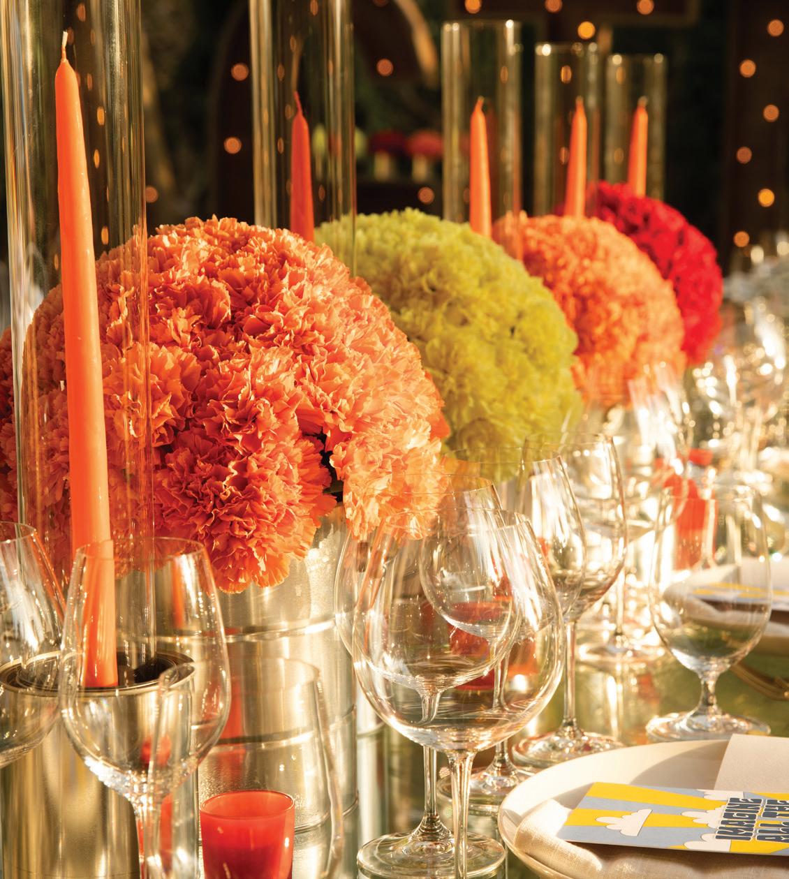 Floral arrangements cascade from ceilings and pianos; dramatic arches burst with color; and clever touches (like petite decks of personalized playing cards) pepper her designs. The planner constantly looks for new inspira-