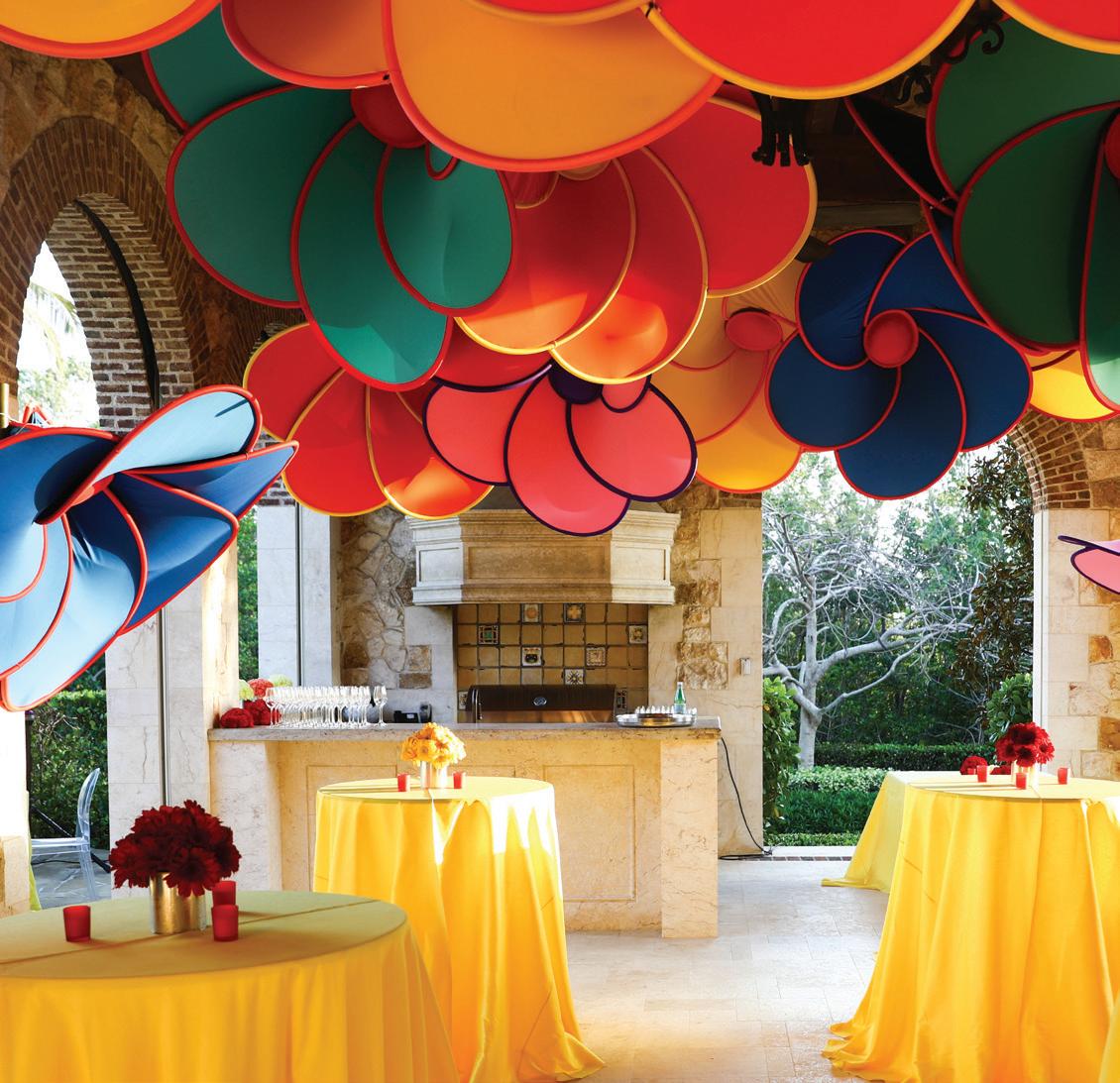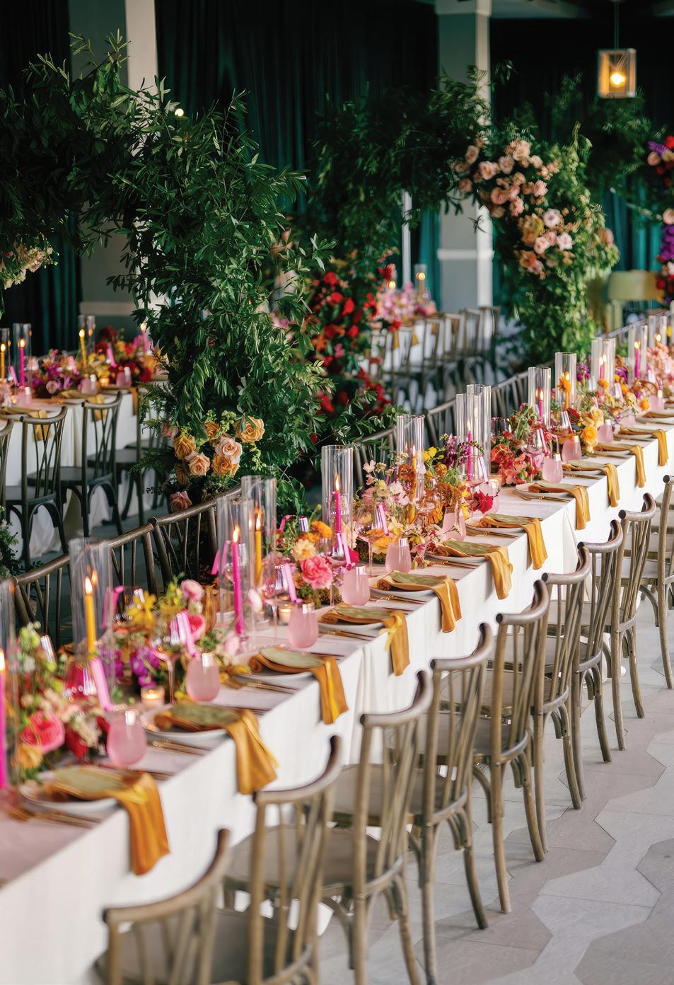 The spirit of the psychedelic era influenced every detail— from Ashley’s not-so-mellow yellow dress by Taller Marmo (an adornment in its own right, with its riotous feathered sleeves), the Volkswagon Bus parked out front for photo ops and a flower-powered entry. The hosts drew inspiration from Andy Warhol’s portrait of John Lennon for the color palette. Mingling in the elegant, Mediterranean Revival lanai during cocktail hour, guests clinked glasses beneath a sea of hanging, oversized flowers made of stretch fabric in citrusy hues and shades of pink and blue by Swag Decor in Orlando. Post drinks, the 39 diners sauntered onto the manicured lawn and took their seats at Lucite tables.