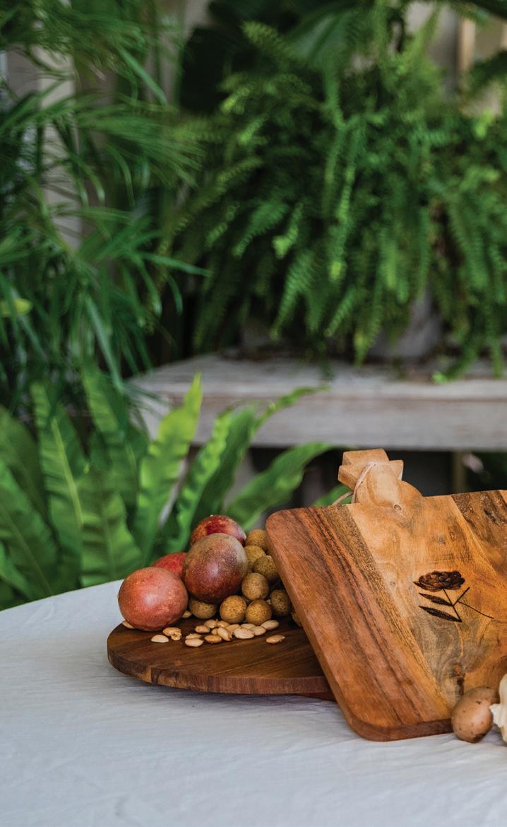 Like a jazz band, Kaleidoscope’s designers improvise their arrangements, working with what’s on-hand and their lofty imaginations. This cocktail table takes its notes from the focal coconuts, accented with avocados found on Sean’s parents’ property and