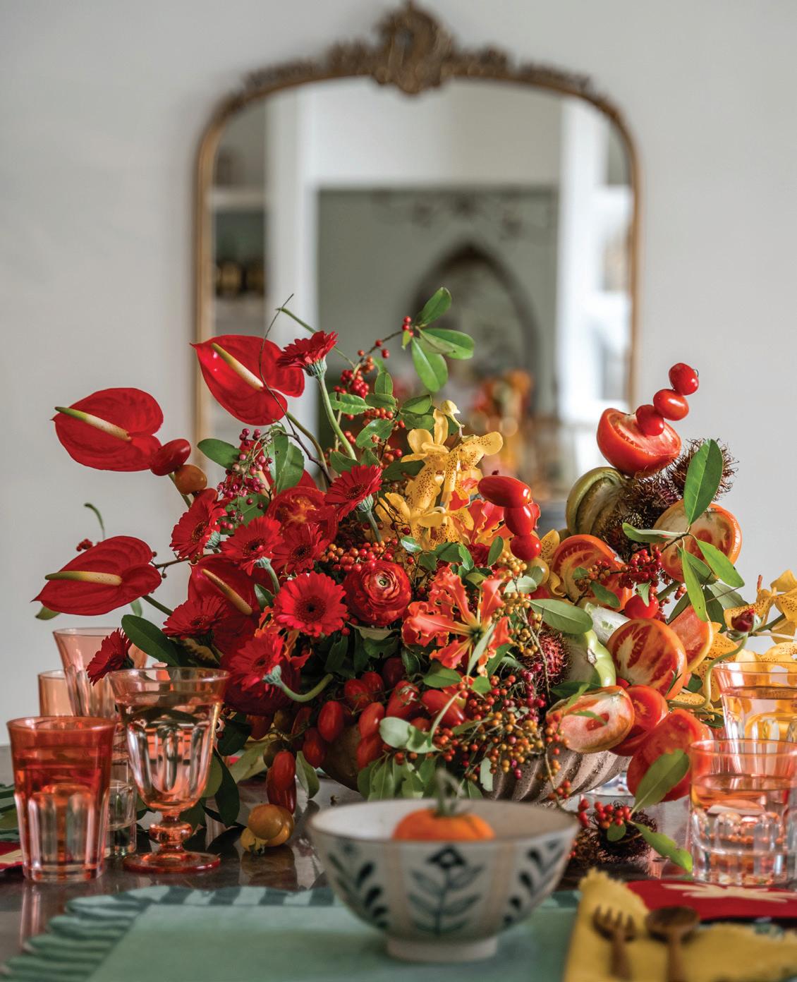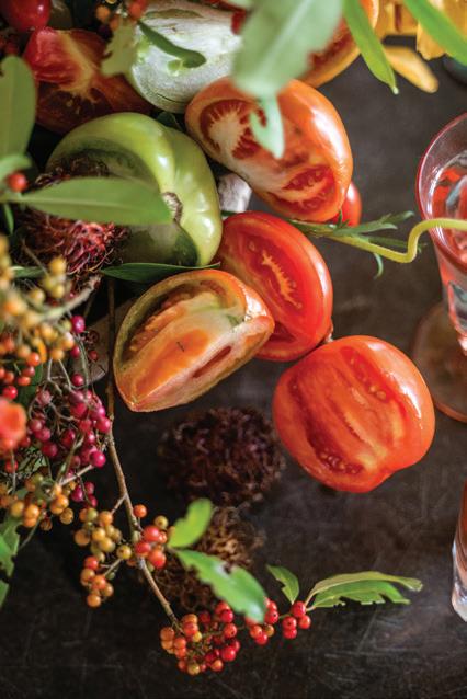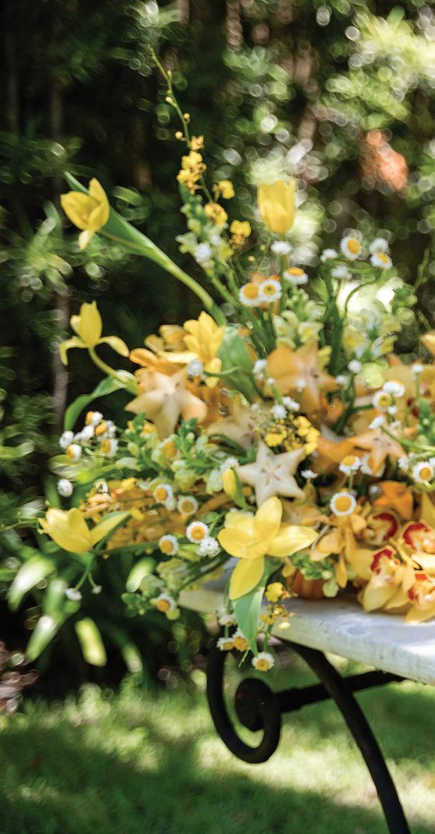 Kaleidoscope’s master florists love drawing from local markets and coowner Sean Stevenson’s parents’ lush property. For an inviting lunch table, they skewered a medley of sliced tomatoes to showcase the fruit’s varied textures and shades. Red flamingo flowers and poppies complement the dominant hues; spiky rambutans from Buckingham’s Tigertoes Herbs and Teas lend an edge; and yellow blooms recall the ripening Florida sun. (If your ‘maters are extra juicy, look up hacks to curb the drip.)