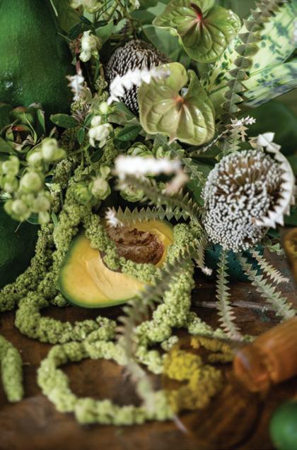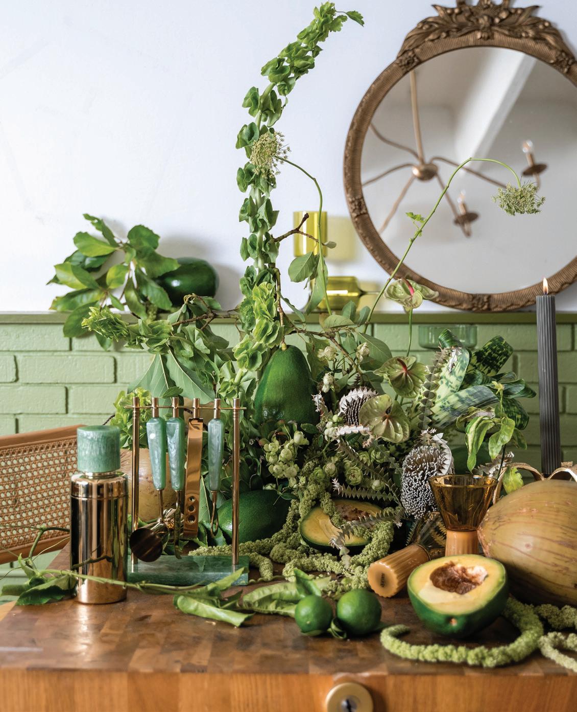 at Tigertoes Herbs and Teas. The result: a jungle with bells of Ireland, avocado tree branches, snaking amaranths and zesty limes weaving around the drupes. After the party, crack the coconuts open for a hydrating sipper to toast a picture-perfect Florida night.