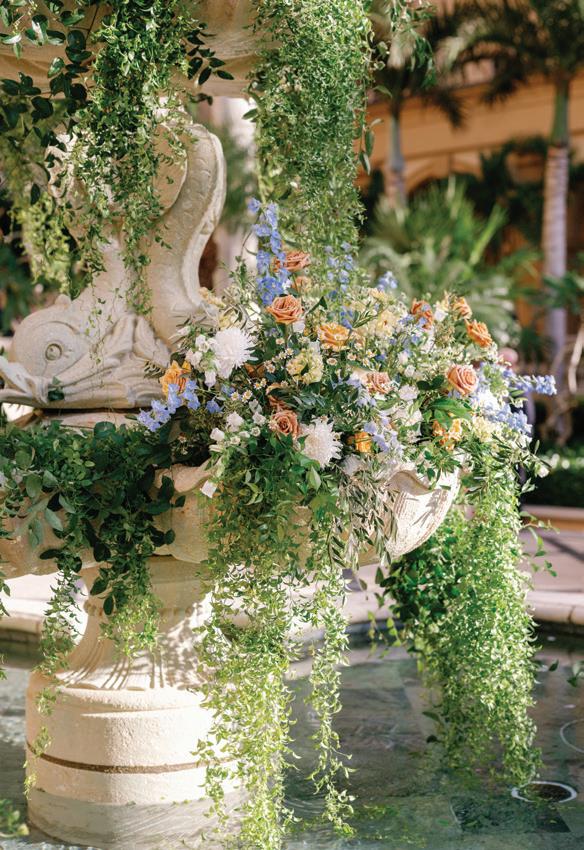 For a recent Marco Island gathering, her team built a trellis filled with feathery Italian ruscus and vibrant bougainvillea. “It fully immersed the space and set the tone,” she says. Don’t sleep on the architecture, either, says Tom Trovato of Naples’ Tom Trovato Event Floral & Design. “In Italy, you have all these old churches and cathedrals that are marked by age, crumbling into surrounding gardens. That could inspire a beautiful statement piece with Old World architecture and lush gardens,” Tom says.