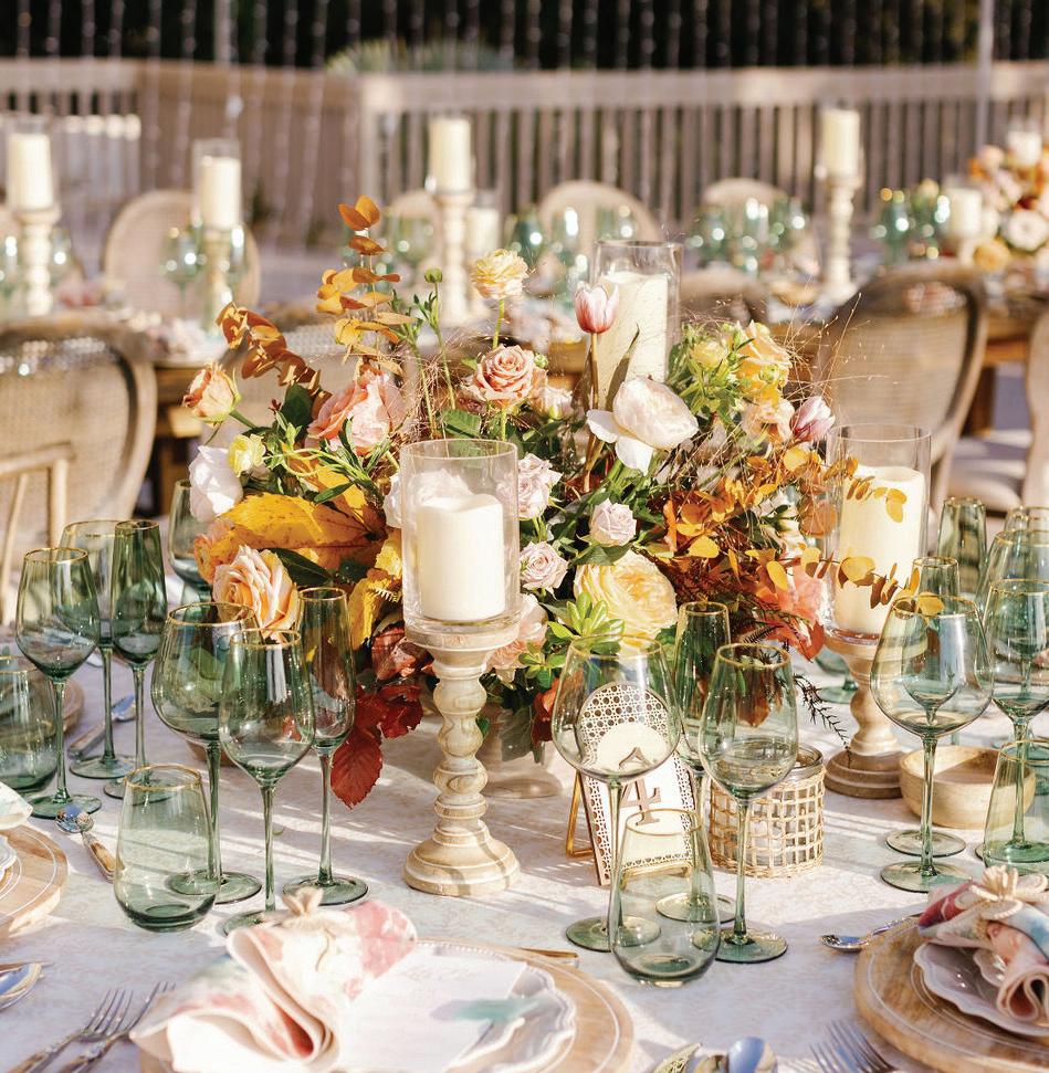 If social media is any indication, everyone spent this summer in Italy. Capture the dolce vita with details that nod to authentic places and times from the Bel Paese. Jana Tobey, of Tobey Events, sourced traditional Sicilian ceramics for a recent party and paired them with lemons for a visual pop and aromatic allure in the tablescape. “We also featured [Sicilian] dishes like arancini and cannoli,” she says. Margaret Events, in Naples, tapped into the Mediterranean island’s allure, emphasizing Sicily’s orchards and artistry via lemon topiary centerpieces and a cake with a majolica tile motif by Naples’ Sweetified. Regional flora goes a long way—but think beyond olive trees, says CocoLuna Events’ Courtney Armen.