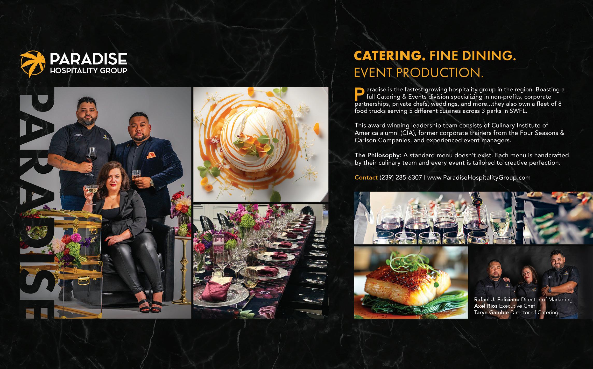 This edition of Celebrate is all about bringing the wow factor to your special occasions. To start, we introduce you to Naples’ boldest new catering group, The Rose House (p. 12); and sommelier Zach Bingham provides a cheat sheet for picking the perfect wines for blended groups (p. 16). Each value-friendly bottle appeases casual drinkers while wowing any die-hard oenophile in your crew. A silky tempranillo from