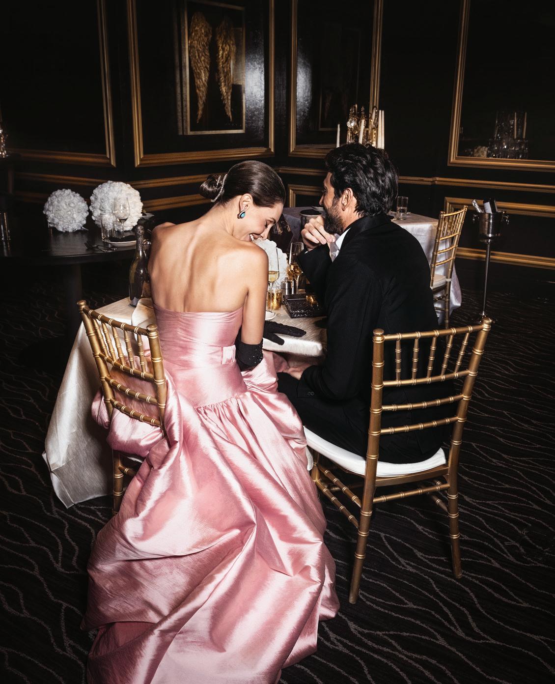 Shot on location at The London Club in Bellasera Hotel, in Naples, Omar Cruz Models Julianne Steege, Elite Models; Reed Favero, Next Management. Stylist Veronica Porras. HMUA Duality Artistry. Julianne wears a dress by Silvia, Valentino black crystal opera gloves, turquoise, diamond and enamel earrings by Patricia Robalino Designs, shoes from Voyetté and a Patricia Robalino Designs diamond necklace on her hair. Reed wears a tuxedo by House of Gray, an Eton shirt and ascot by Stefano Ricci. Props/chairs Pro Event Rental, Naples.
