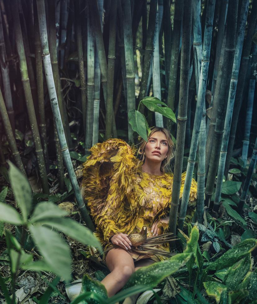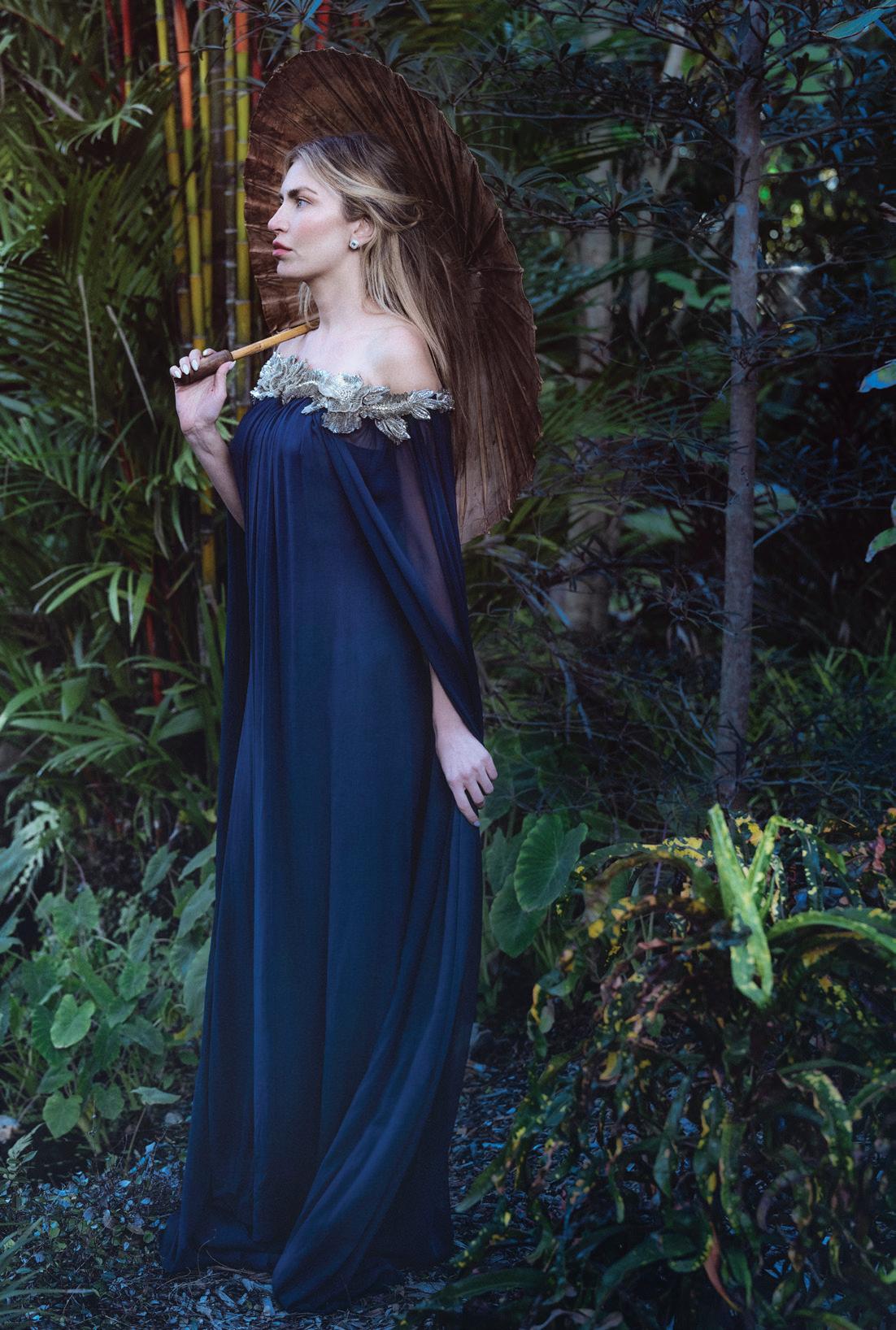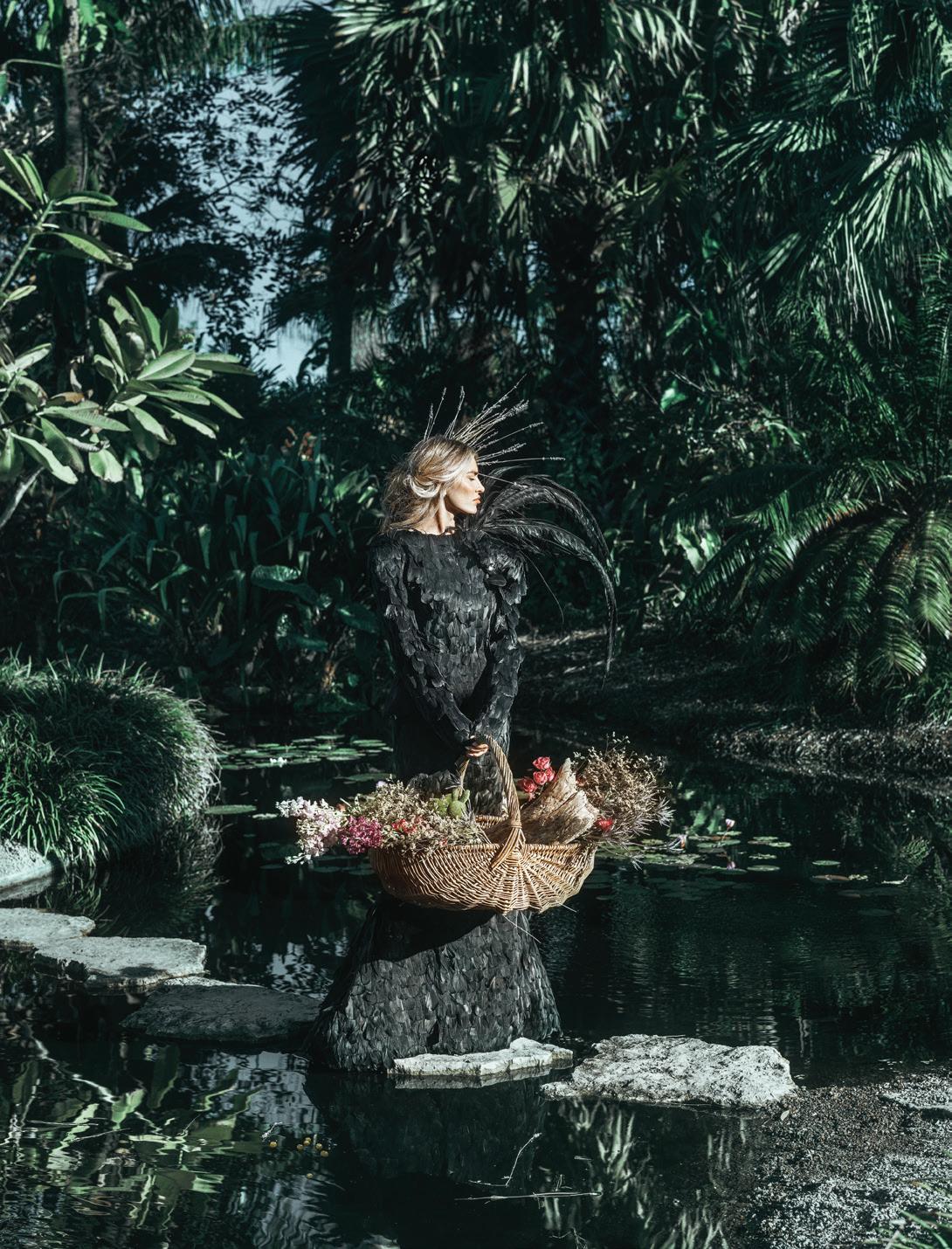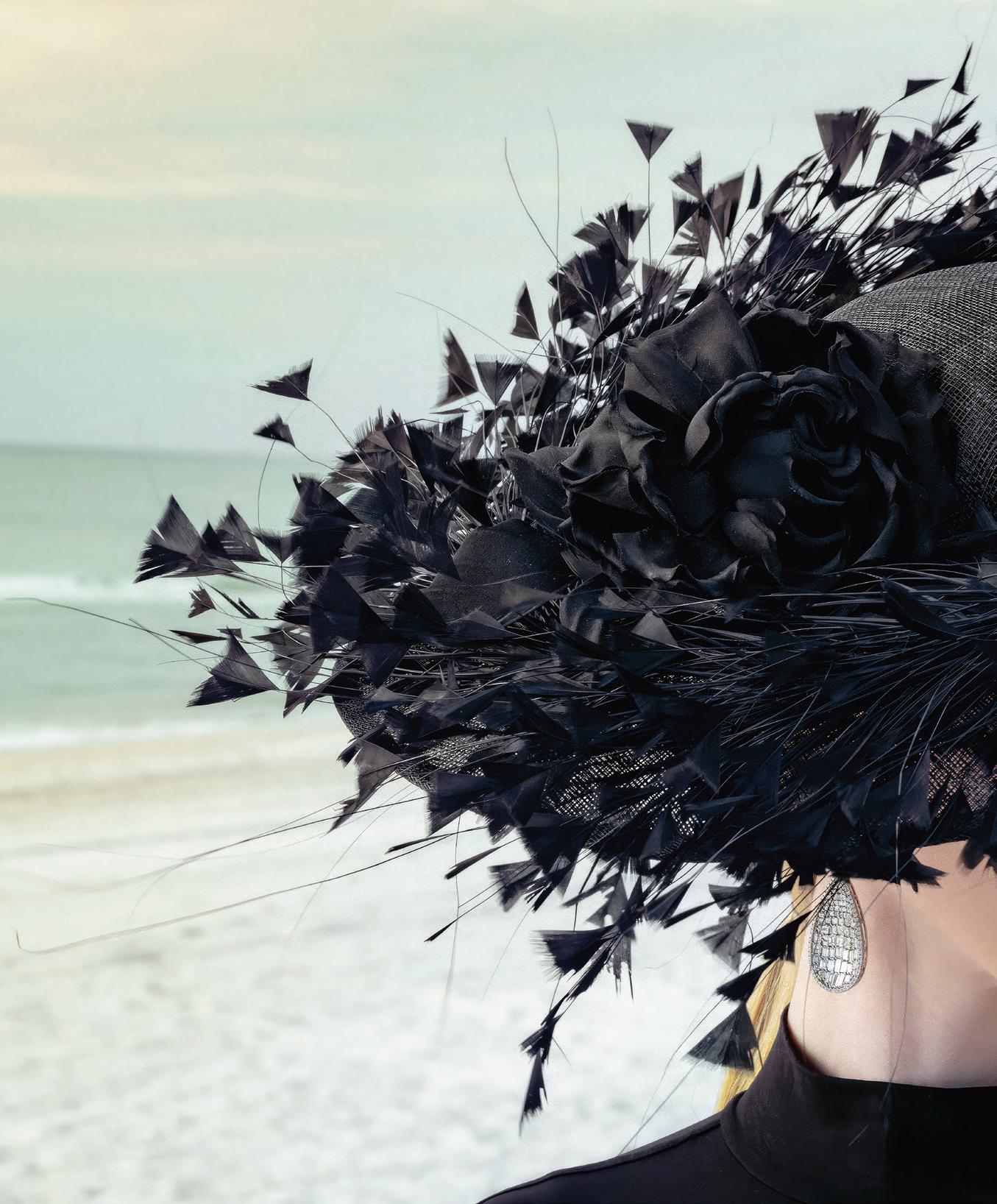 Against Naples Botanical Garden’s lush backdrop, spring fashion embraces nature’s palette with feathered confections and garden party silks.