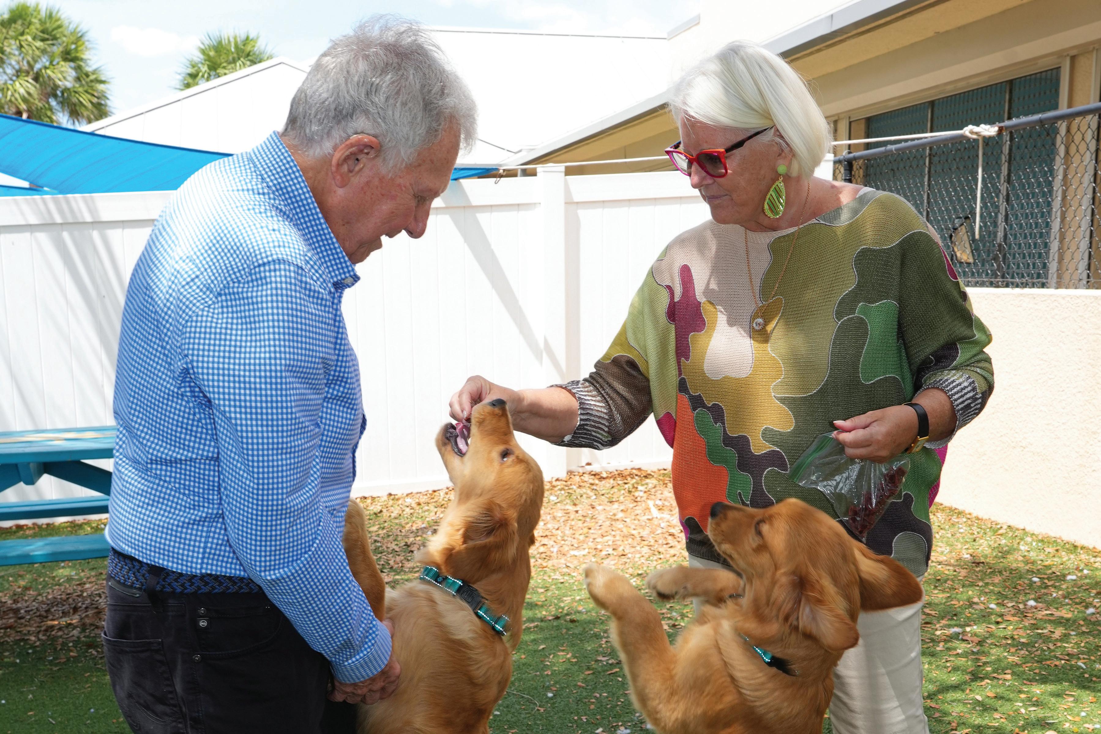 Jay and Patty Baker play with two six-month-old golden retriever puppies in a yard at Patty Baker Humane Society Naples on May 1. Photos by Liz Gorman