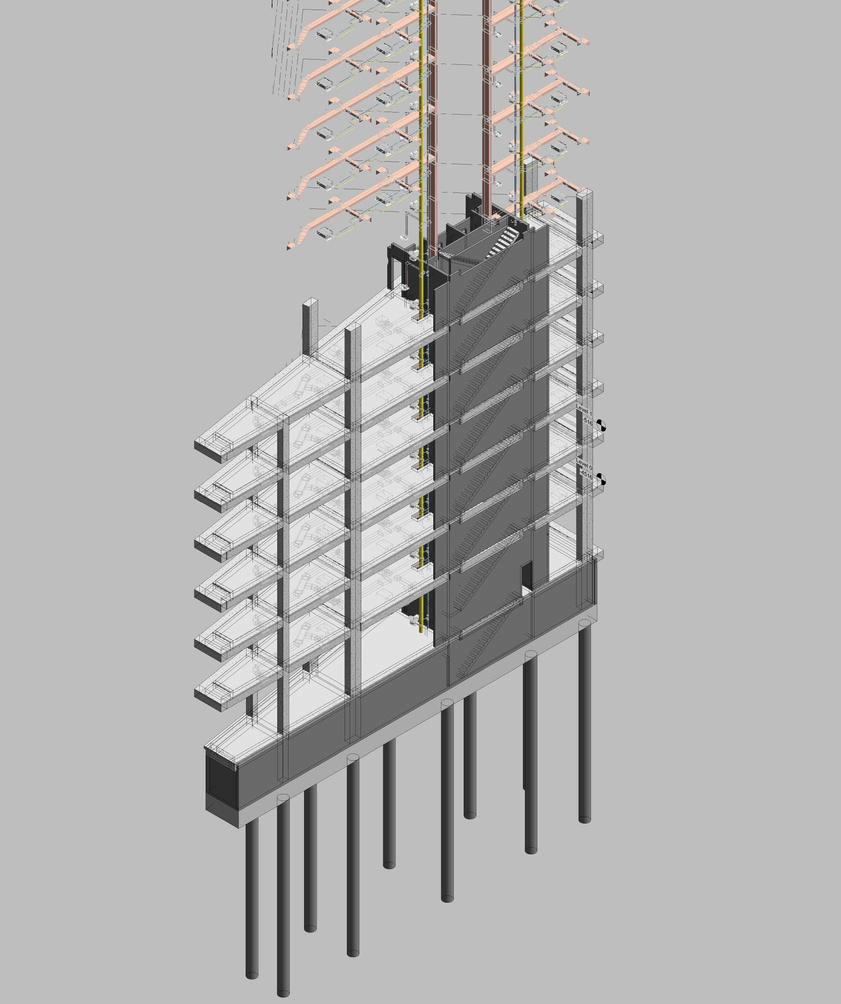 The structural layout follows a minimalist approach, featuring only few columns and a spacious core with walls in various directions to maximize free space, crucial for office environments. The core design comprises two compact boxes for elevator concentration. Work sets for architectural and structural files are created separately and utilized as Revit links, ensuring efficient collaboration and coordination