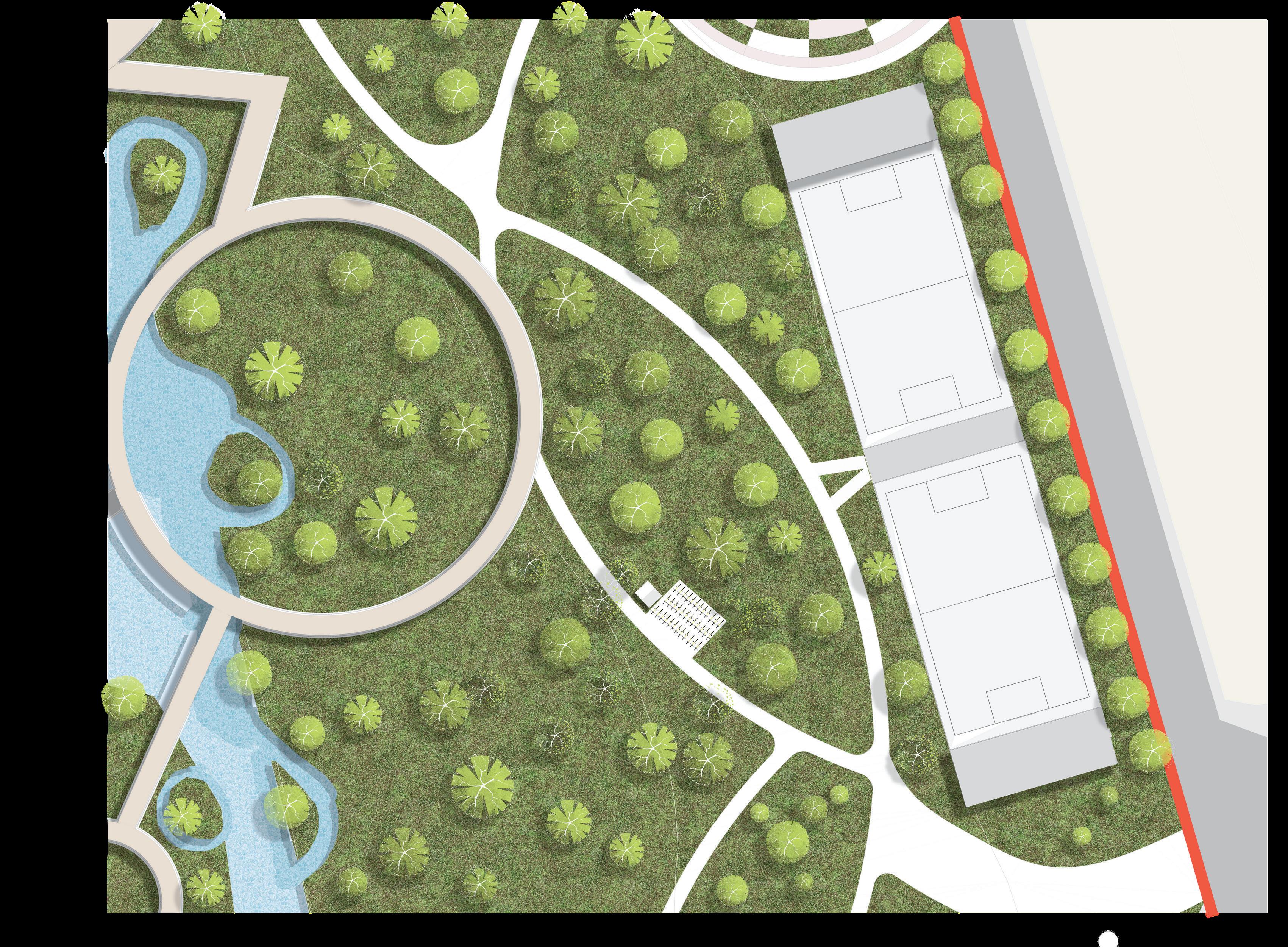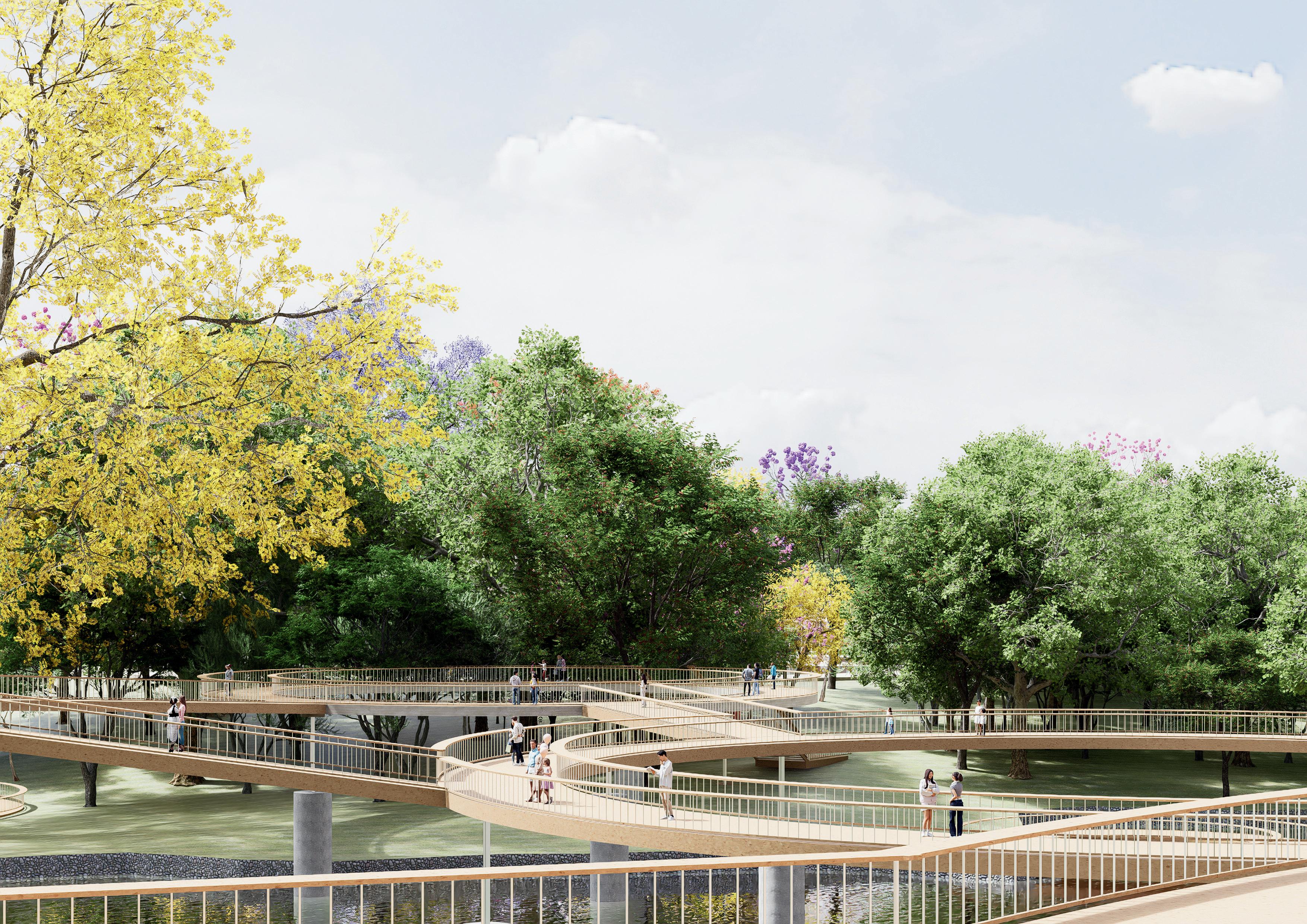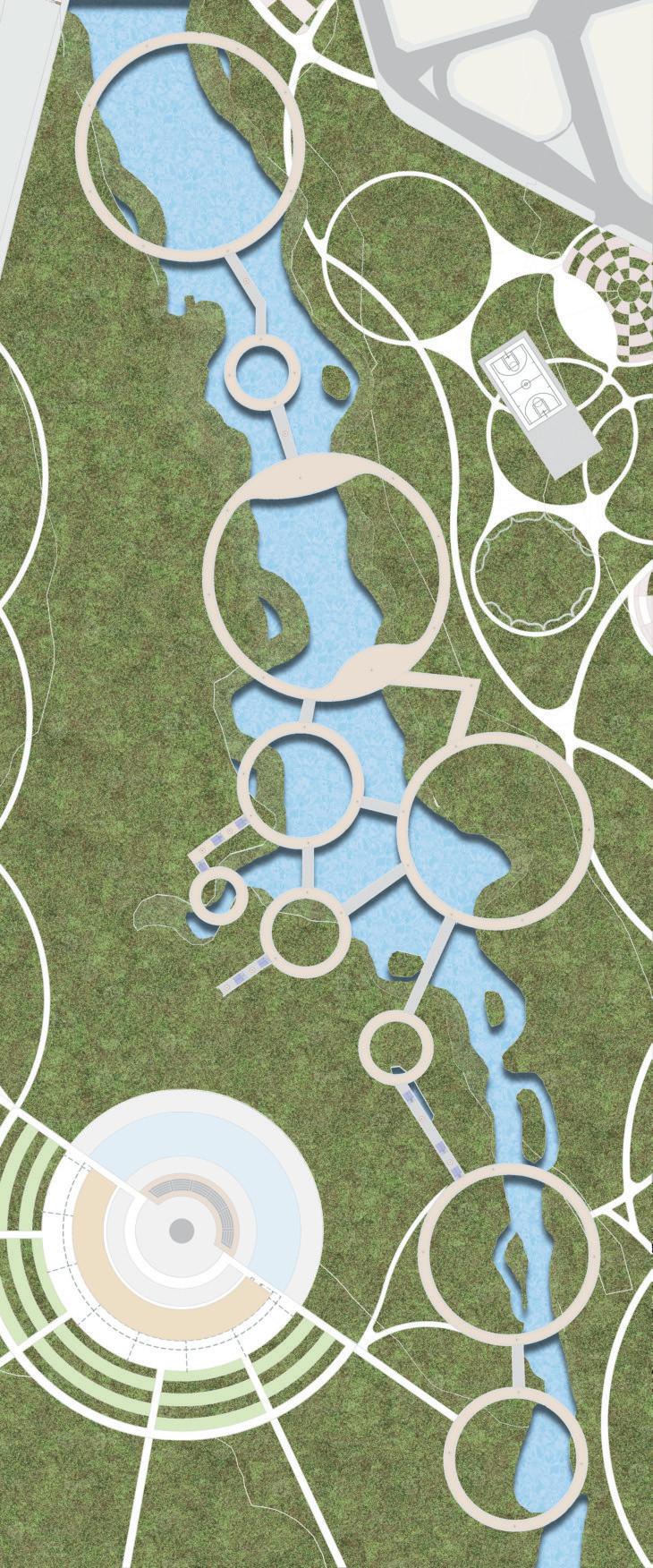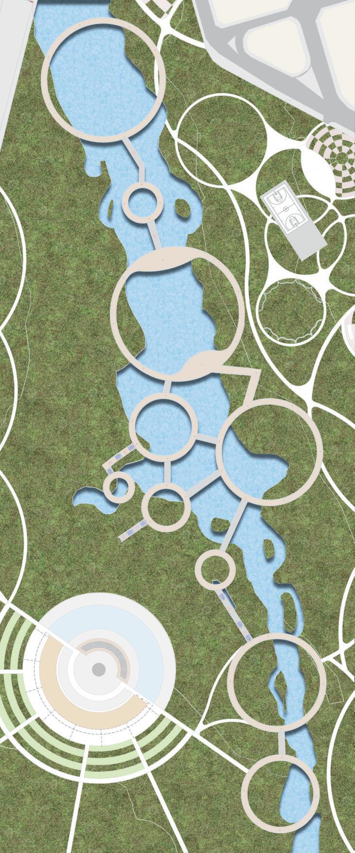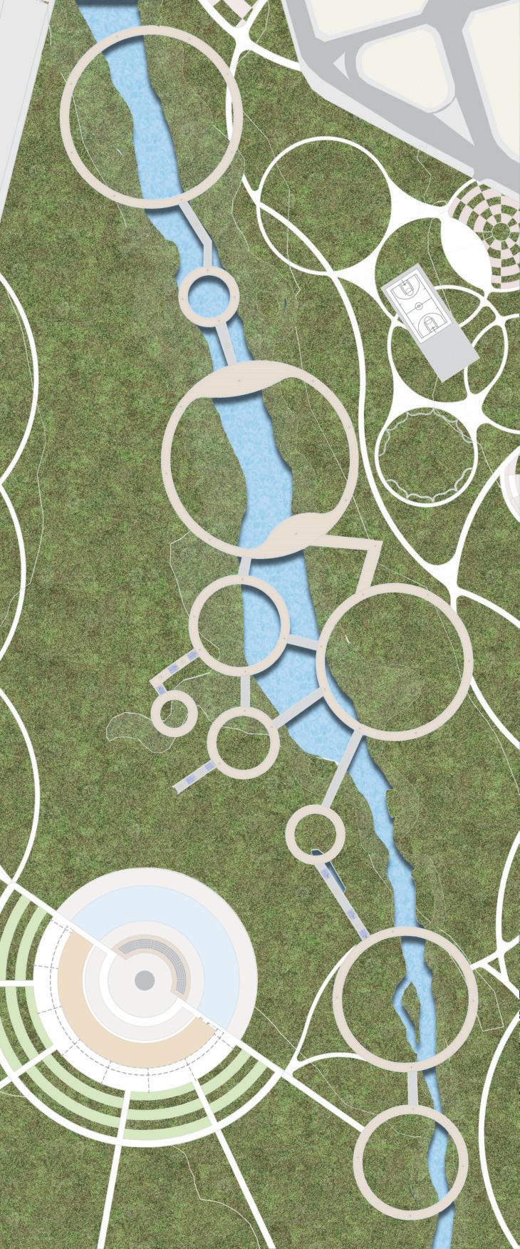 A Ponte Rizoma é concebida como elemento estruturador da conectividade entre a porção central do Parque Botafogo e o bairro Vila Nova, operando não apenas como travessia, mas como espaço público elevado capaz de costurar áreas hoje fragmentadas. Sua geometria circular distribui-se em diferentes níveis e plataformas, permitindo que fluxos de pedestres se acomodem de forma contínua, ao mesmo tempo em que o espaço inferior permanece livre para a circulação natural da água, respeitando a dinâmica hidrológica do vale. Ao evitar obstruções ao curso do córrego, a ponte atua como estrutura permeável, reforçando uma lógica de coexistência entre paisagem e infraestrutura.