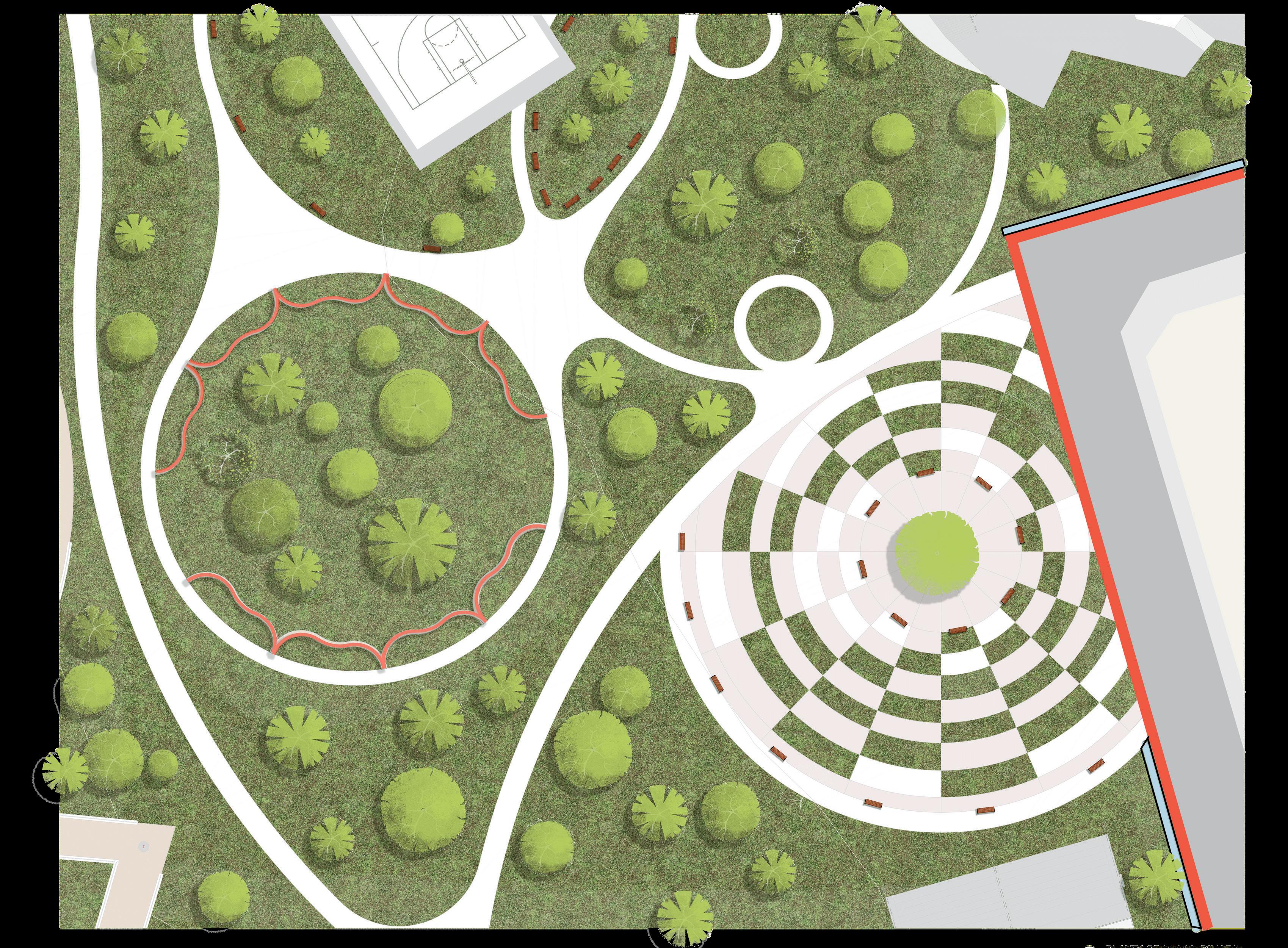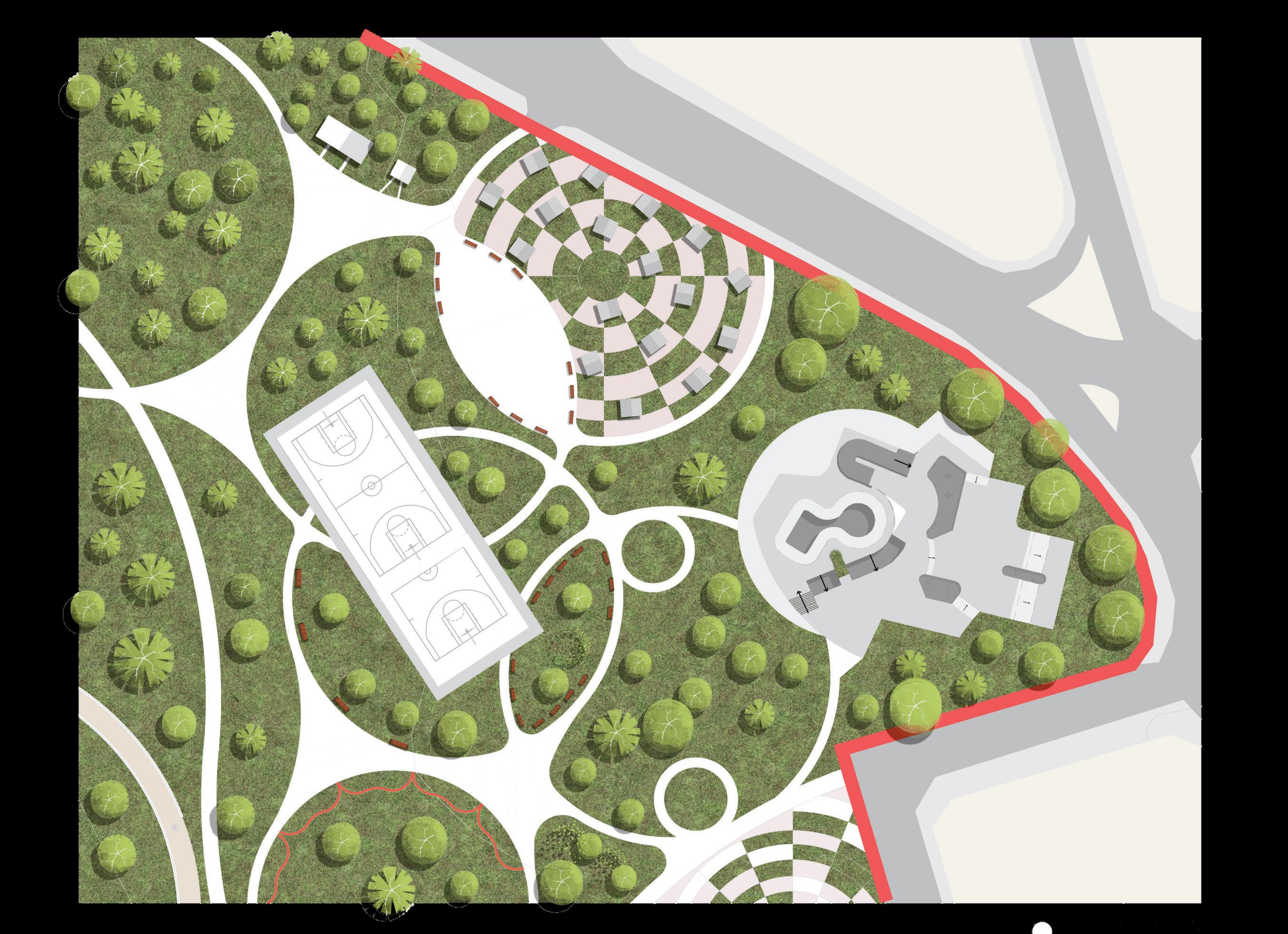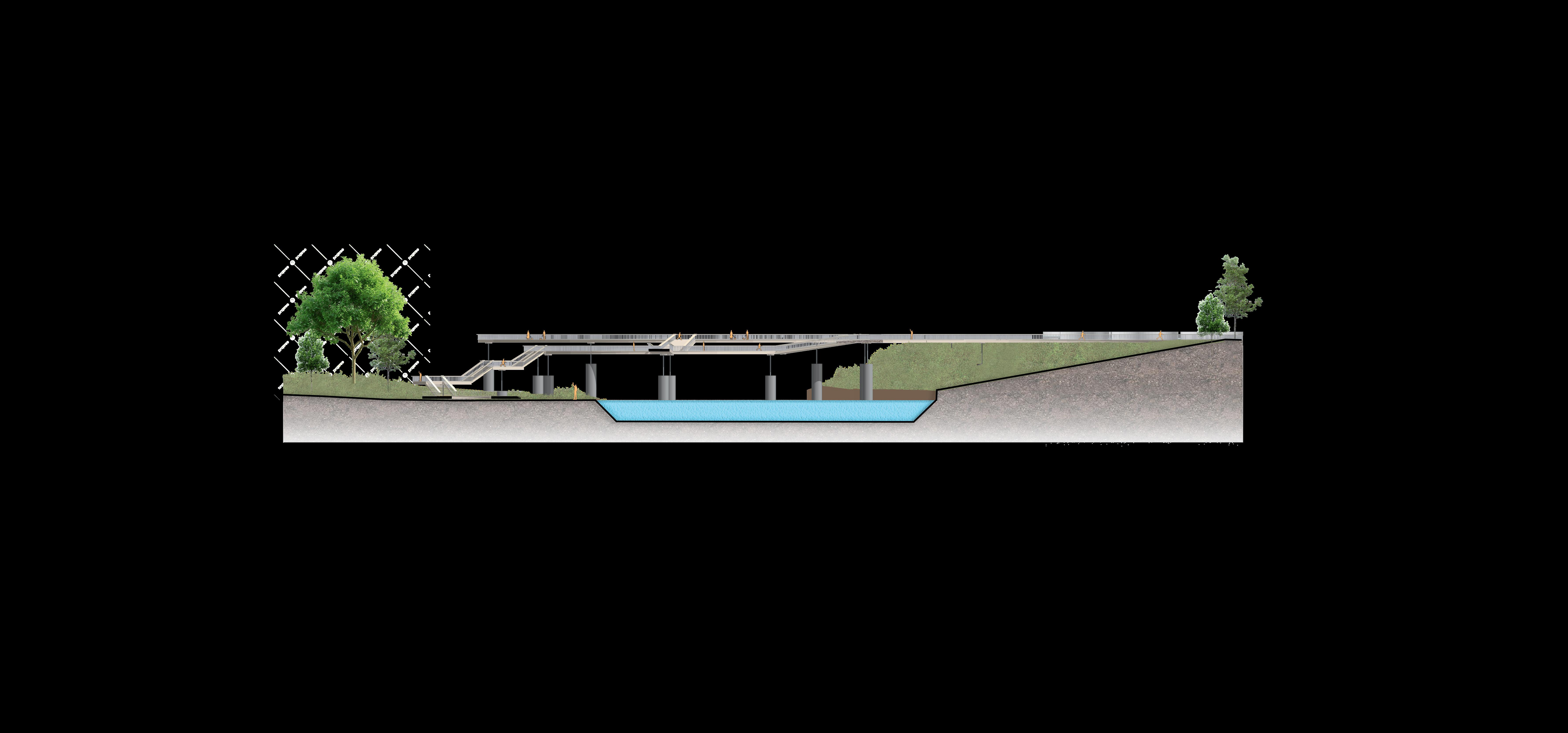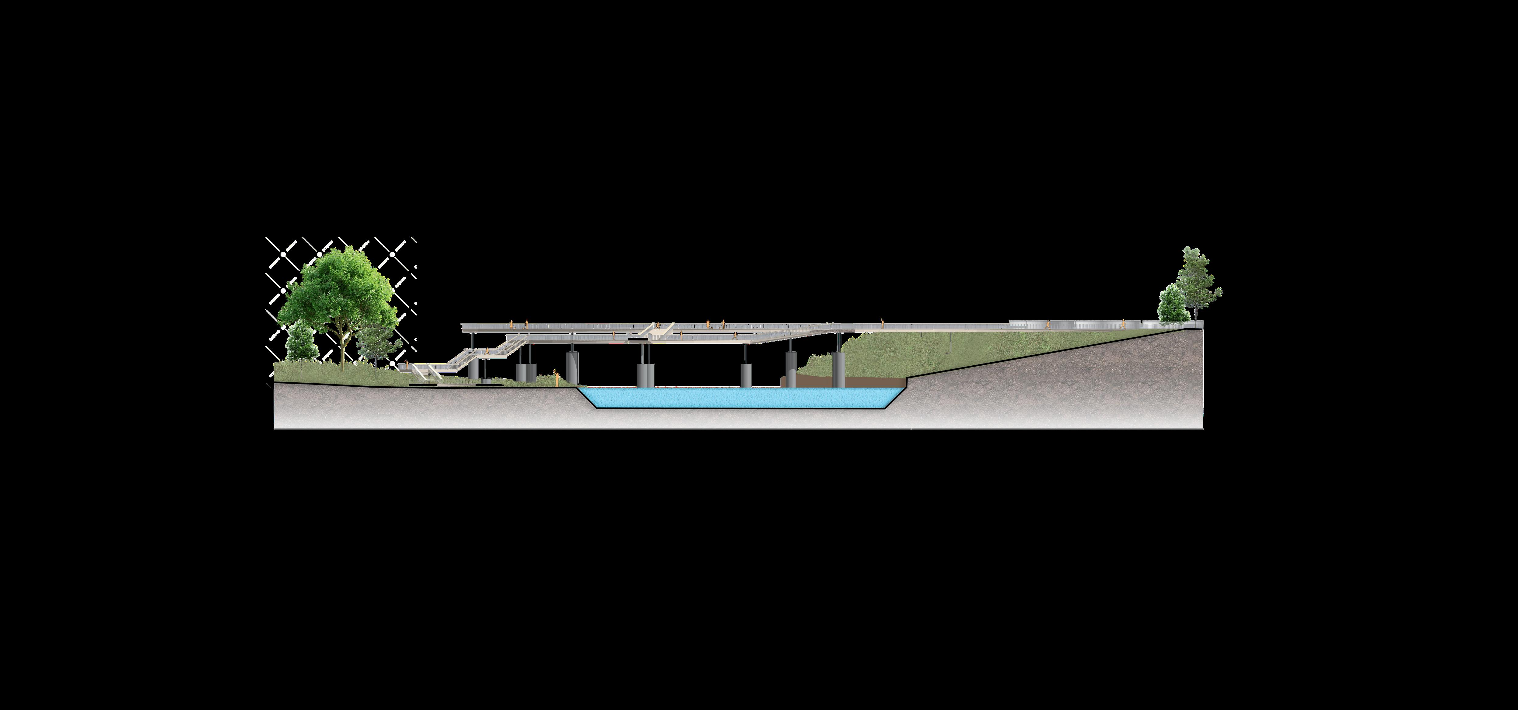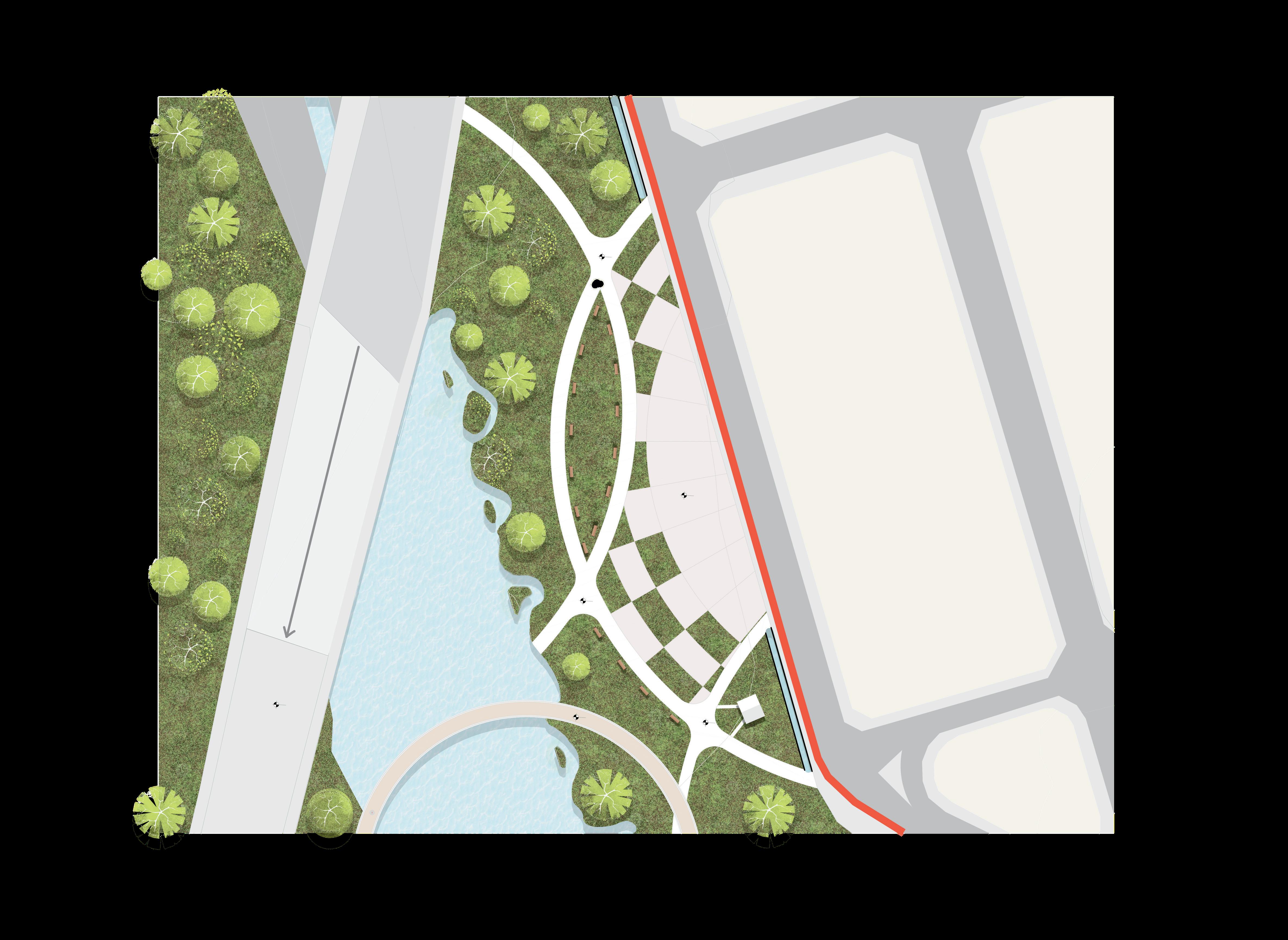 A Ponte Rizoma é concebida como elemento estruturador da conectividade entre a porção central do Parque Botafogo e o bairro Vila Nova, operando não apenas como travessia, mas como espaço público elevado capaz de costurar áreas hoje fragmentadas. Sua geometria circular distribui-se em diferentes níveis e plataformas, permitindo que fluxos de pedestres se acomodem de forma contínua, ao mesmo tempo em que o espaço inferior permanece livre para a circulação natural da água, respeitando a dinâmica hidrológica do vale. Ao evitar obstruções ao curso do córrego, a ponte atua como estrutura permeável, reforçando uma lógica de coexistência entre paisagem e infraestrutura.