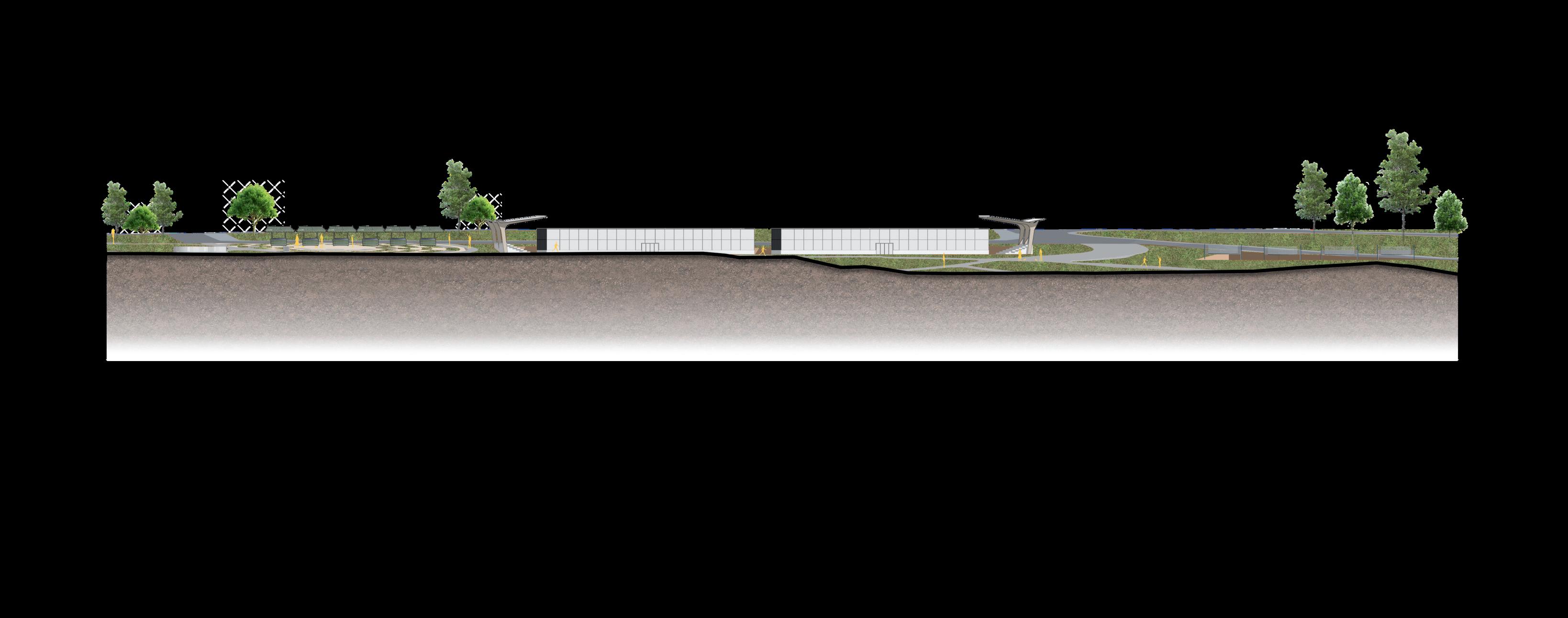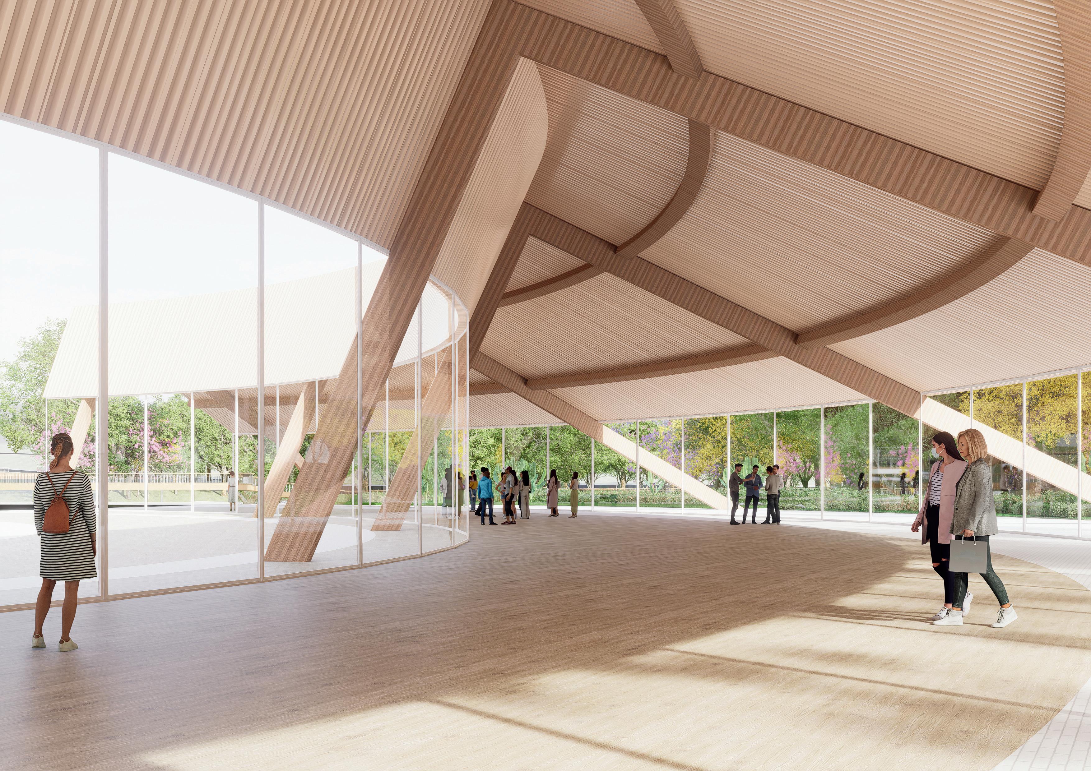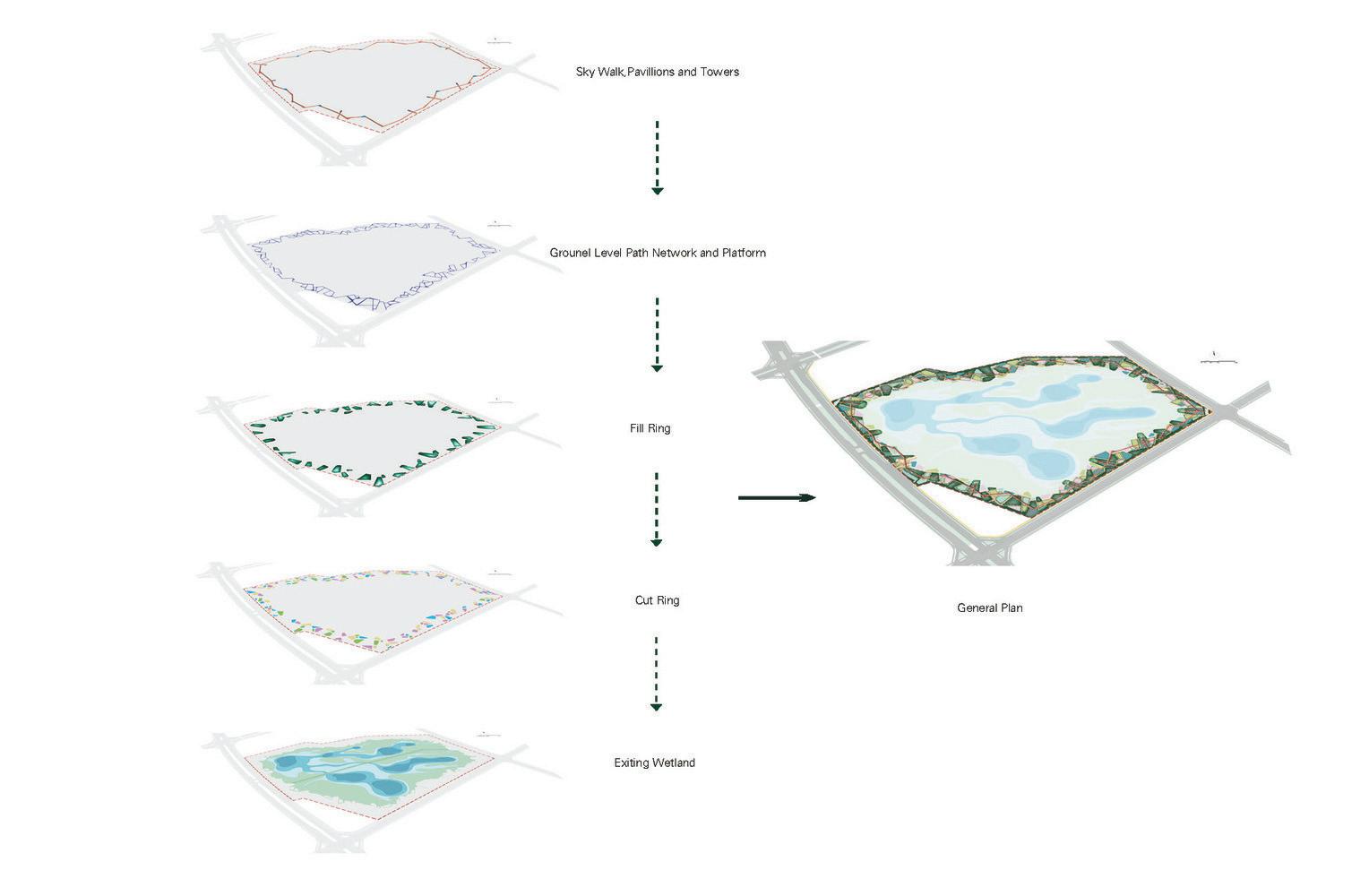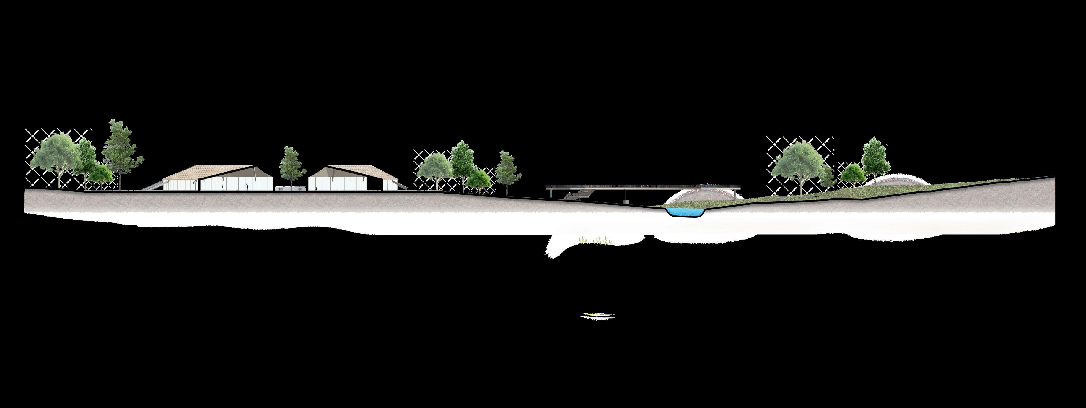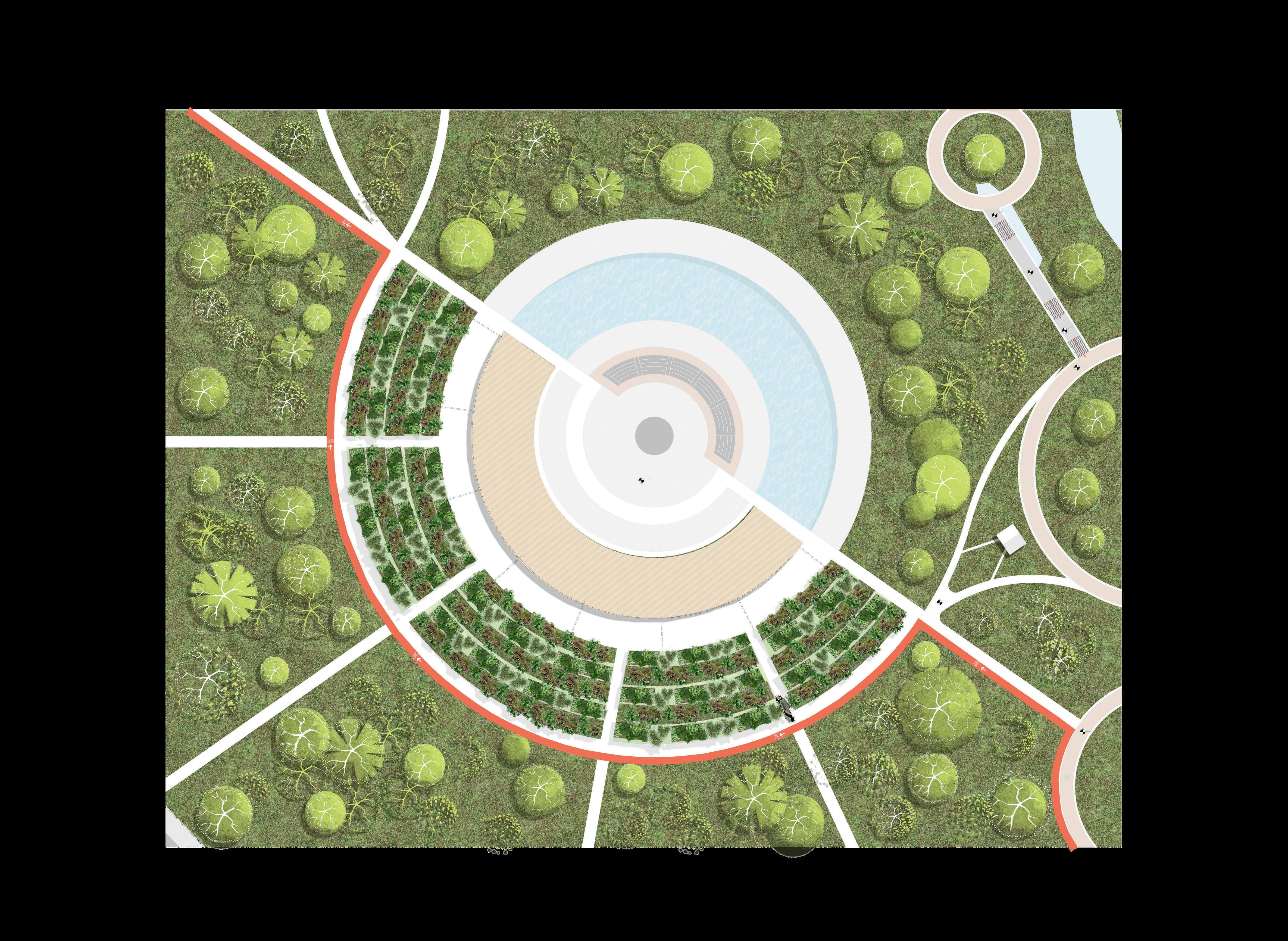 A Ponte Rizoma é concebida como elemento estruturador da conectividade entre a porção central do Parque Botafogo e o bairro Vila Nova, operando não apenas como travessia, mas como espaço público elevado capaz de costurar áreas hoje fragmentadas. Sua geometria circular distribui-se em diferentes níveis e plataformas, permitindo que fluxos de pedestres se acomodem de forma contínua, ao mesmo tempo em que o espaço inferior permanece livre para a circulação natural da água, respeitando a dinâmica hidrológica do vale. Ao evitar obstruções ao curso do córrego, a ponte atua como estrutura permeável, reforçando uma lógica de coexistência entre paisagem e infraestrutura.