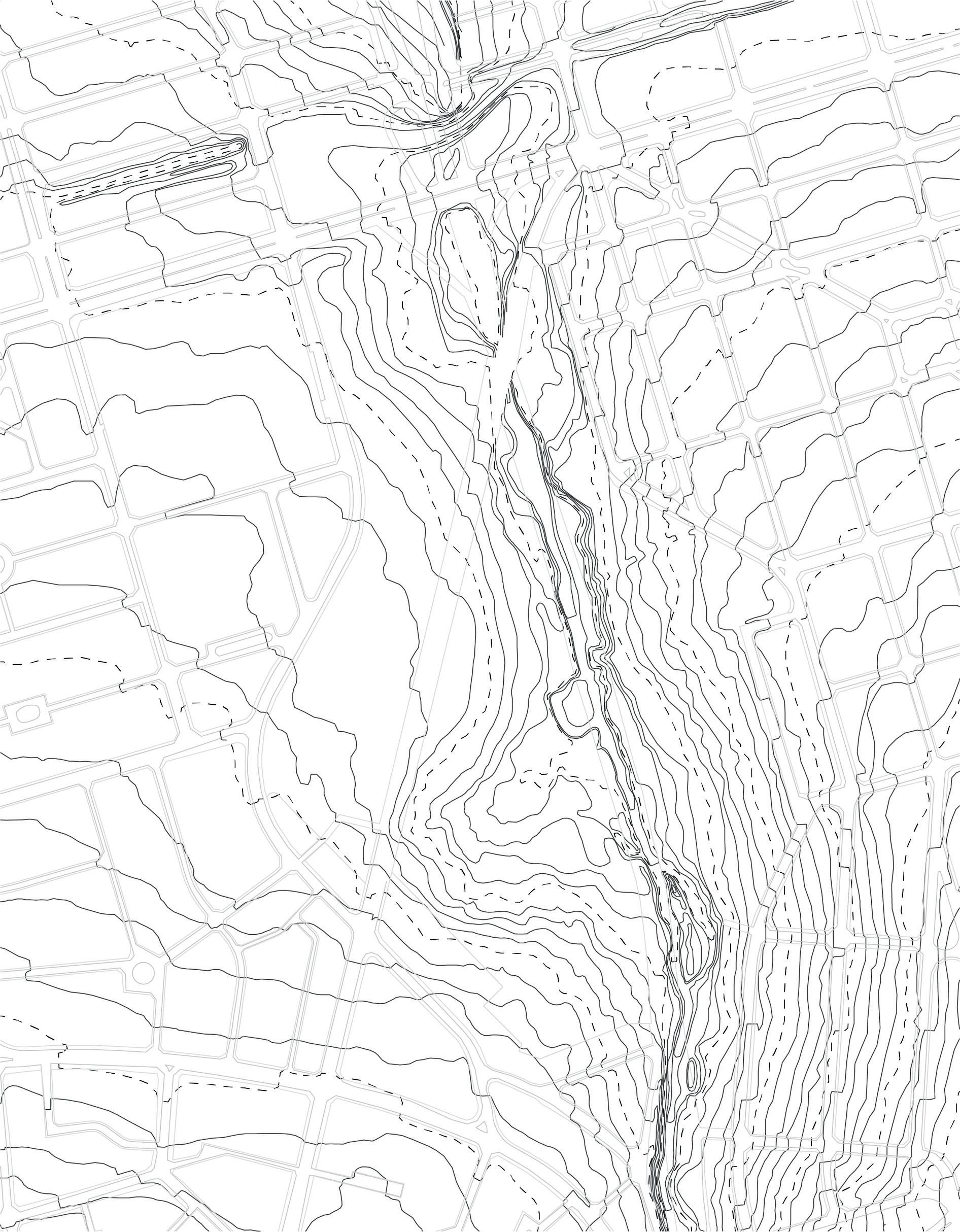 O Parque Botafogo apresenta uma topografia marcada pelo vale suavemente encaixado do córrego Botafogo, configurando um perfil longitudinal contínuo que acompanha o curso d’água. As encostas exibem declividades moderadas, variando entre 2% e 5%, enquanto o fundo do vale mantém-se predominantemente plano, favorecendo a formação de áreas úmidas e trechos de várzea. A variação altimétrica entre aproximadamente 720m e 760m evidencia pequenas ondulações naturais do terreno, típicas de fundos de vale urbanos. Essa conformação topográfica não apenas influencia a percepção visual e a dinâmica de uso do parque, como também oferece condições favoráveis à implantação de estratégias de drenagem urbana sustentável. A estrutura do relevo permite aproveitar o escoamento por gravidade, facilitando a condução, infiltração e retenção das águas pluviais por meio de sistemas como bacias de detenção, valas verdes, wetlands construídos e jardins de chuva ao longo do eixo do córrego.