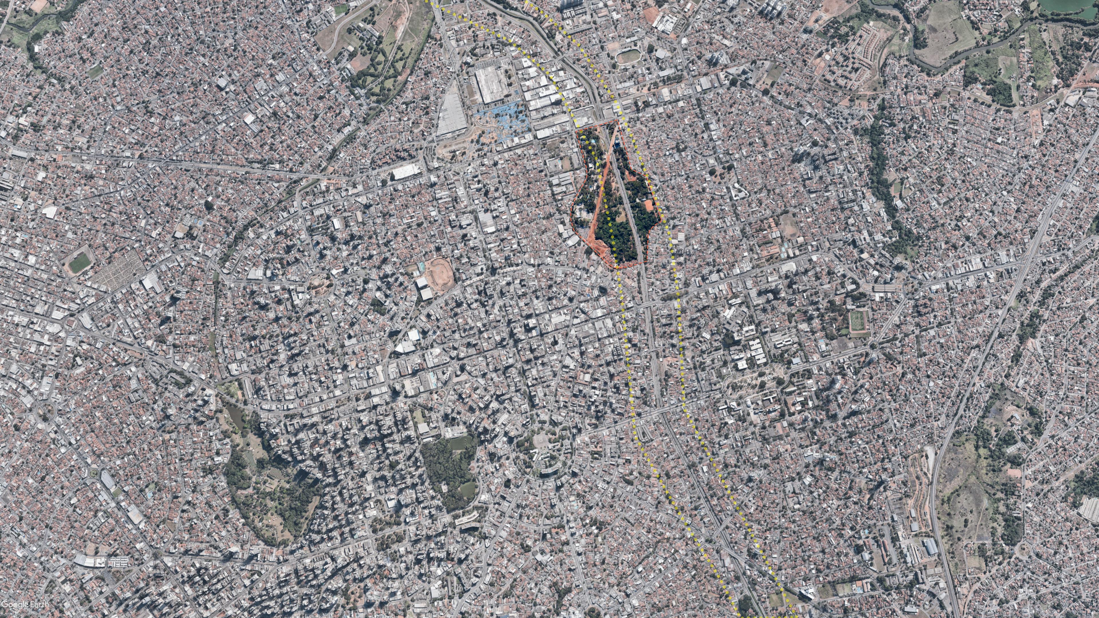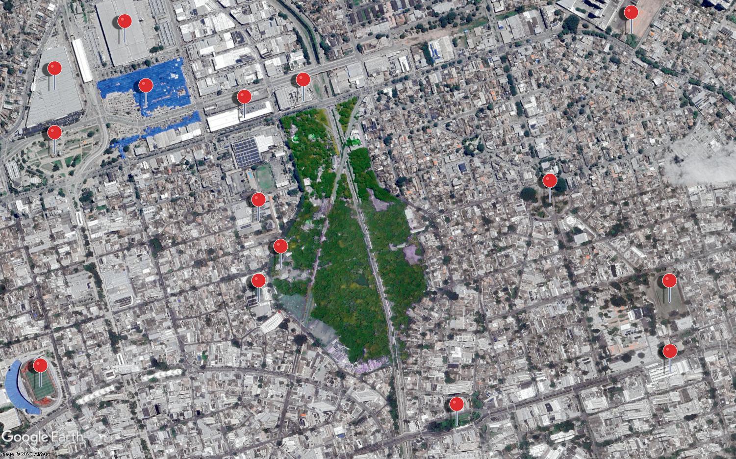 A leitura dos cheios e vazios no entorno do Parque Botafogo evidencia a forma como a ocupação urbana se estrutura e como os espaços livres se distribuem ao longo do vale do córrego. Os cheios correspondem às áreas edificadas — quadras residenciais consolidadas, frentes comerciais ao longo das avenidas e equipamentos institucionais — que conformam um tecido contínuo e relativamente denso, exercendo forte pressão sobre o espaço natural do parque. Essas áreas construídas definem bordas rígidas e pouco permeáveis, com fraca relação de fachada ativa voltada ao corredor ecológico. Em contraste, os vazios urbanos aparecem de forma linear e fragmentada ao longo do eixo do Parque Botafogo, representando áreas de preservação, faixas verdes, trechos de várzea e clareiras de uso público. No entanto, esses vazios não funcionam como um sistema totalmente conectado; muitos segmentos são interrompidos por infraestruturas viárias, ocupações irregulares ou trechos subutilizados, o que reduz o potencial de continuidade ecológica e de mobilidade ativa.