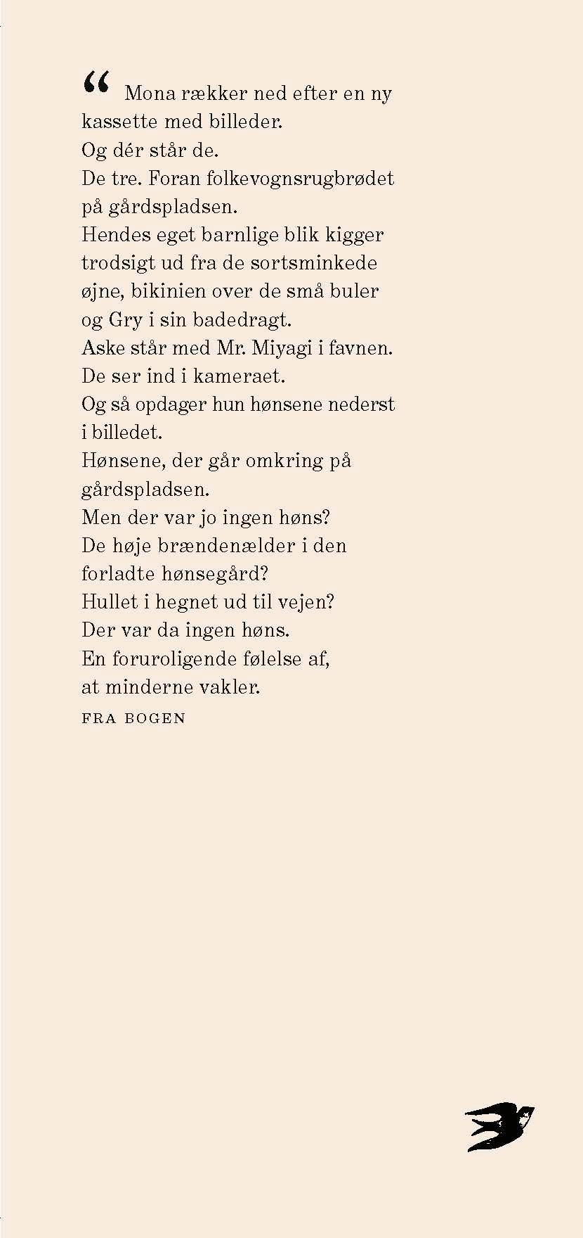 Der står de med armene om hinanden. Hun og Gry og Aske i haven på Røde Port, solen i ryggen, og foran dem falder skyggerne. Det er en sommeraften, det må være den sidste sommer, for hun har sin turkise bikini på, ankelkæden. Kroppene er brune, håret hvidt af solen, røgen fra bålet i det gyldne aftenlys og stammetegninger fra flyveasken, der markerer, hvor de kommer fra, hvor de hører til. Smagen af salt hud og sorte snobrød, svalernes skrig og suset af frihed i børneflokken, den vilde hujen gennem markerne mod stranden, stråene mod benene og Grys hånd i hendes. Lyden fra Allans knallert, der nærmer sig. Og under brystet sommerfuglenes flaprende vinger, da det stille vand lukker sig om deres ranglede kroppe. Fodaftrykkene kaster lange skygger i det kølige, aftenrøde sand. I haven er duggen trukket over græsset. De høje stemmer, den sødlige, skarpe lugt af udåndet sprut, lurende, opfarende vrede. Og nattekulden kryber ind i knoglerne. Lyden af glas, der splintres i mørket, når op til sengene med de lilla lagner, den lange gang med alle værelserne.