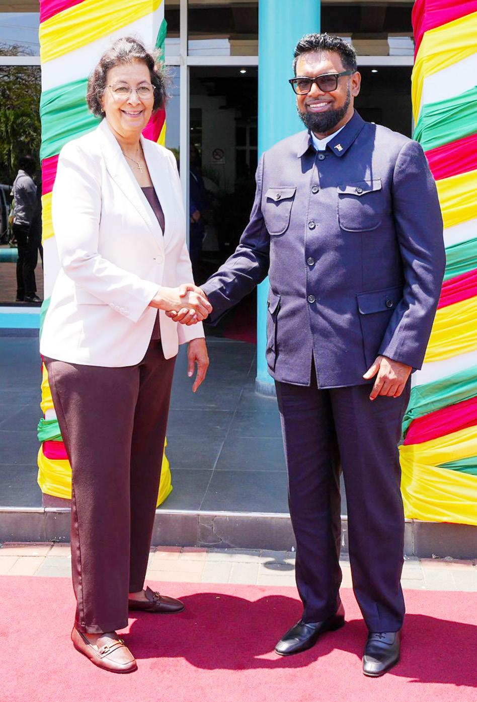 PRESIDENT Dr. Irfaan Ali and Suriname’s President Dr. Jennifer Geerlings-Simons met in Nickerie, Suriname, on Saturday to discuss bilateral initiatives aimed at strengthening trade, tourism, and regional connectivity.