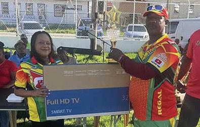FLASHBACK: MVP Stanley Mohabir collects his trophy and television from USA-based Guyanese Shabellia Hashim.