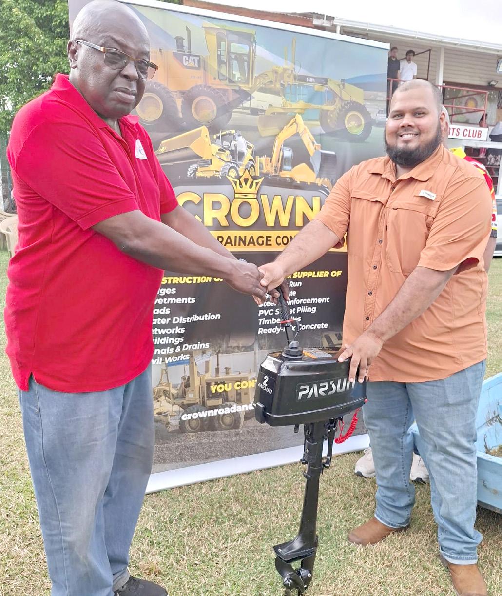 At two simple ceremonies, held at the Gandhi Youth Organisation (GYO) ground on Woolford Avenue, Georgetown, the official “home” of the GSCL, Crown Road & Drainage Contractors presented an outboard engine to GSCL’s President, Ian John, while ARD Youtuber handed over a boat.