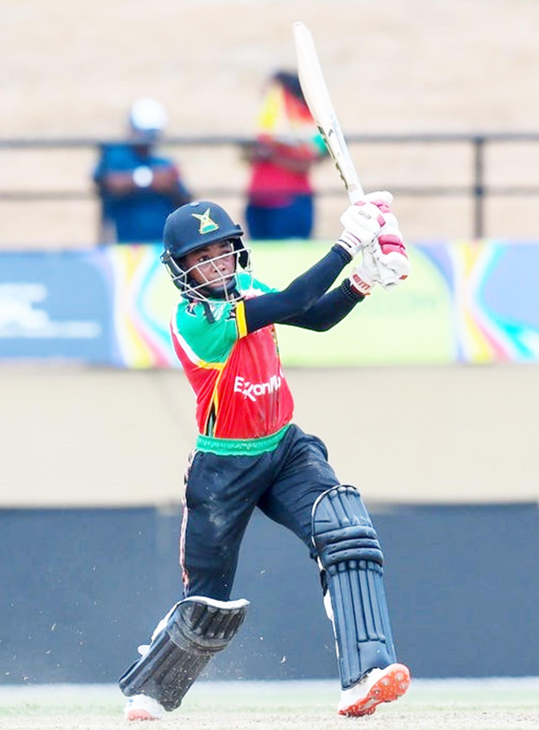 Shemaine Campbelle of Guyana Amazon Warriors hits a six (Photo by Randy Brooks - CPL T20/CPL T20 via Getty Images)