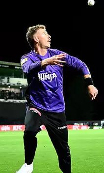 caught by Quentin Sampson at deep square leg after facing 42 balls and hitting three sixes and two fours.