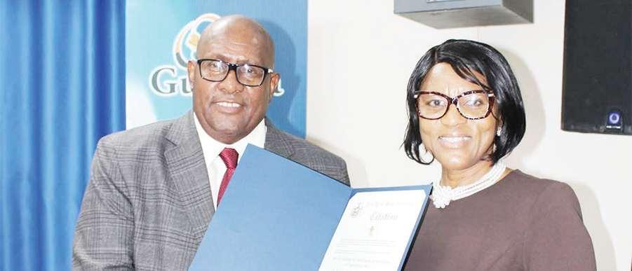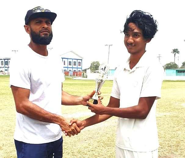 RayadLatif(right)receiveshisMan-of-the-MatchTrophy fromChairmanoftheGCB’sCompetition’sCommittee ShawnMassiahaftertaking7-12forGTyesterdayatLBI
