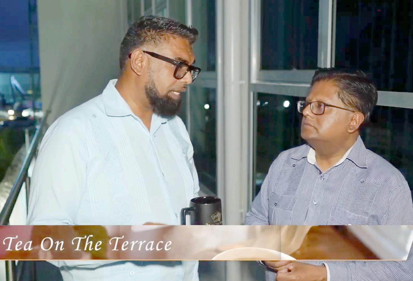 President Dr. Irfaan Ali and Finance Minister, Dr. Ashni Singh during an airing of the Tea on Terrace programme