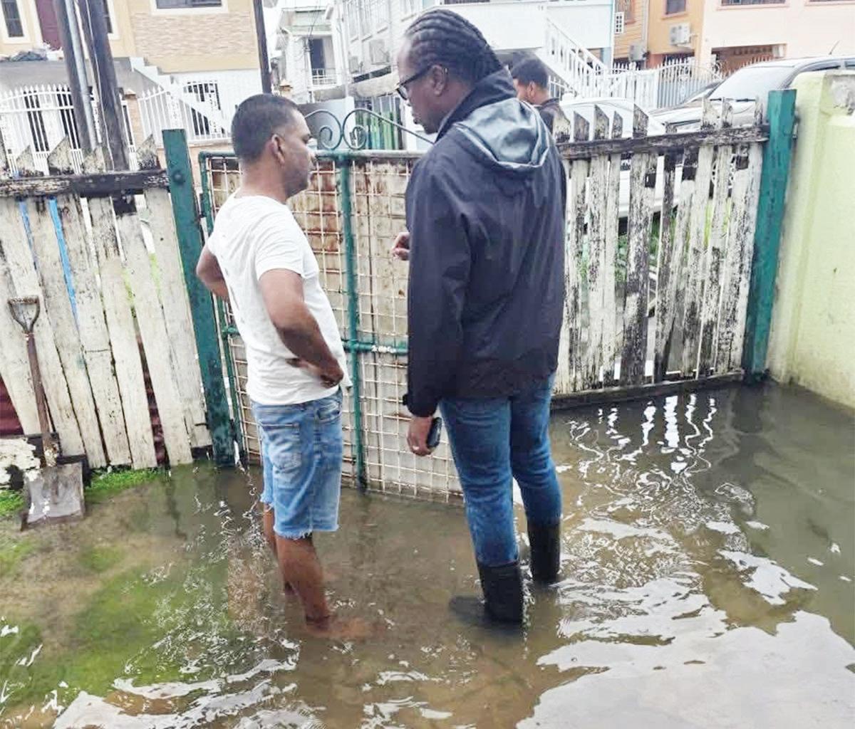 Minister within the Ministry of Culture, Youth and Sport, Steven Jacobs, interacts with residents in Kitty while assessing the impact of flooding