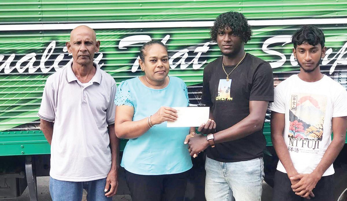 Secretary Natasha Bhikhari hands over sponsorship cheque to Nicholas Cameron while Robby Kissoonlall and Balraj Narine look on