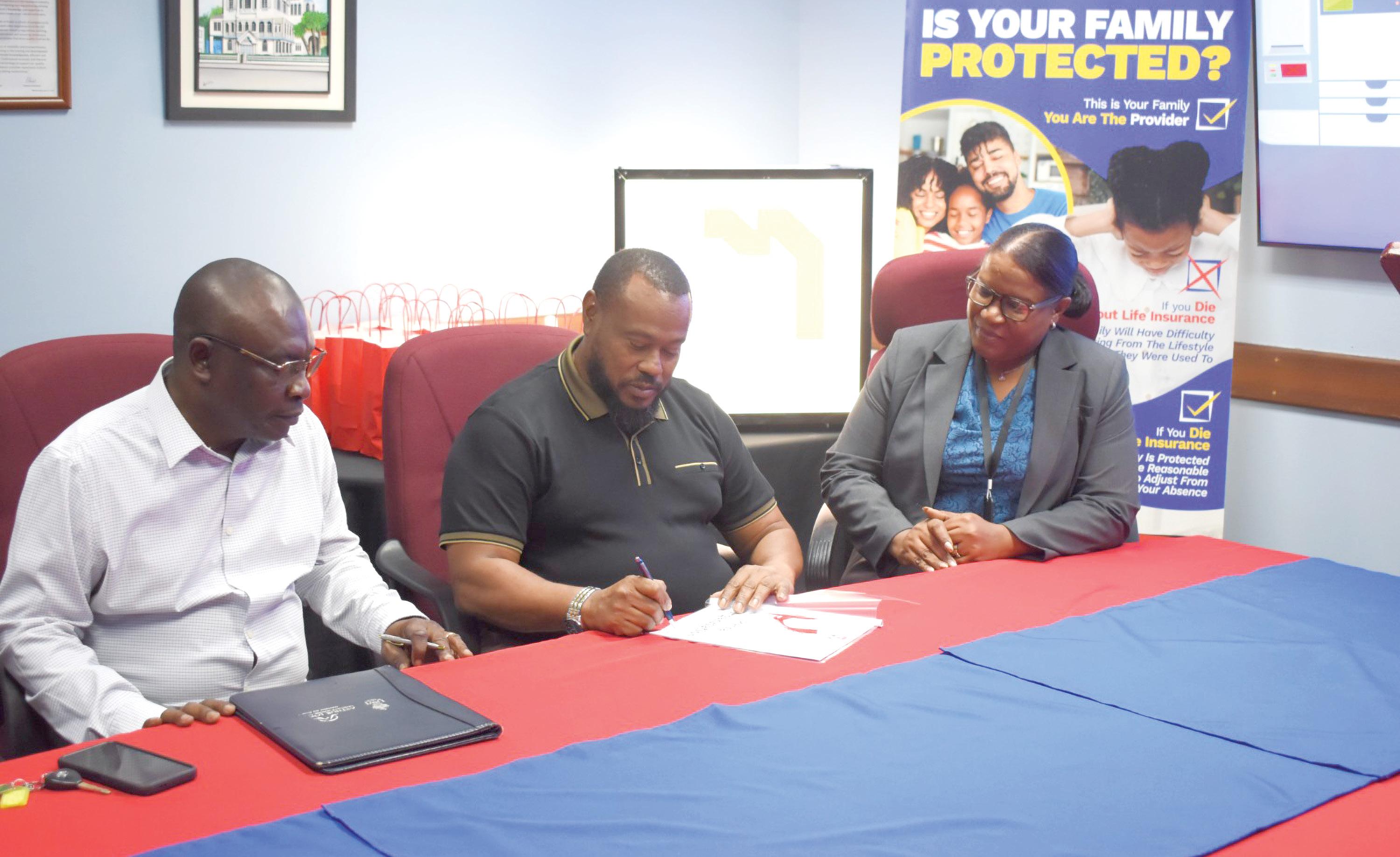 Petra Co- Director, Troy Mendonca (centre), signs the document in the presence of Petra Representative, Troy Peters (left) and Sales and Marketing coordinator at The Demerara Mutual Group, Oceola Van Doimen (right)
