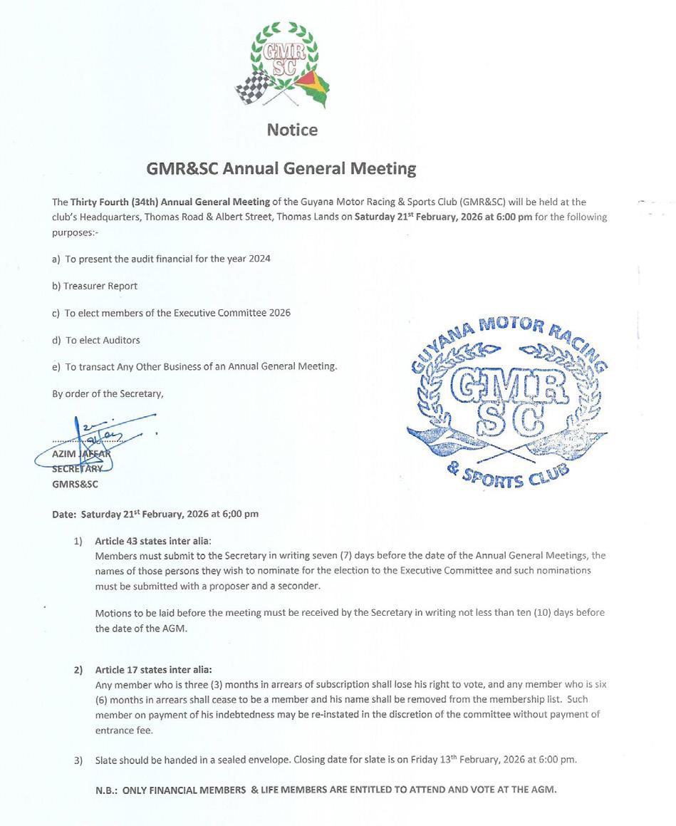 The Guyana Motor Racing and Sports Club (GMR&SC) will hold its long awaited Annual General Meeting and Elections of office Bearers on February 21, 2026.