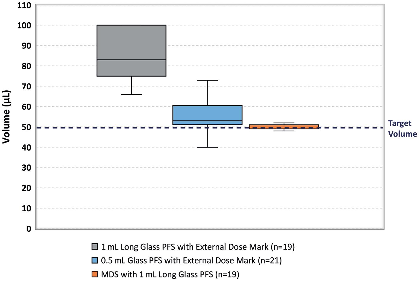 A combination of the Congruence MDS with a 0.5 mL PFS was shown to require even less overfill. For example, with the Congruence MDS, instead of a 165 μL fill being required for a 50 μL dose, only 100 μL is needed – saving the equivalent