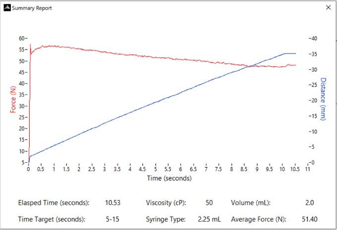 force profiles allow the system to be adapted to accommodate a broad range of drug viscosities, up to 30–50 cP. Furthermore, it allows the adjustment of the flow rate to the desired target value. Configurable injection times are in the range of approximately 10–60 s for an injection volume of 5 mL.