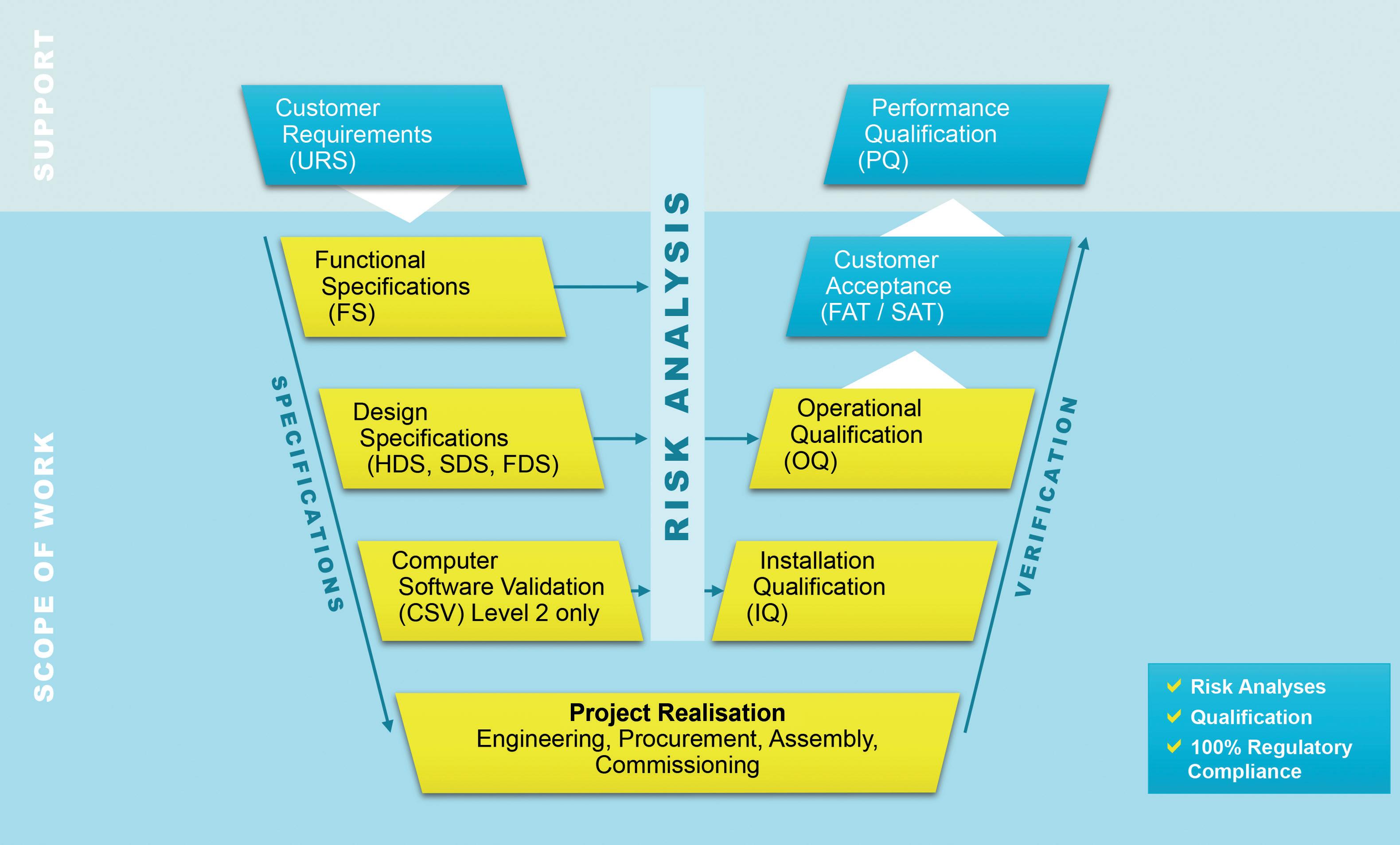 In the production of medtech products, large quantities of consumable products are continuously manufactured and tested. During production, compliance with quality requirements is extremely important. For the medical industry, these requirements and tech accompanying qualification processes are elementary components of the quality management system. Standardised GMP assembly platforms are only released for production if an errorfree qualification process has been carried out by experienced qualification engineers. The aim is to meet the necessary quality and legal requirements and to verify that the system functions as specified prior to the design and build of the system. Especially for custombuild equipment, the engineering team needs to respond individually and carefully to customer requirements for each project.
