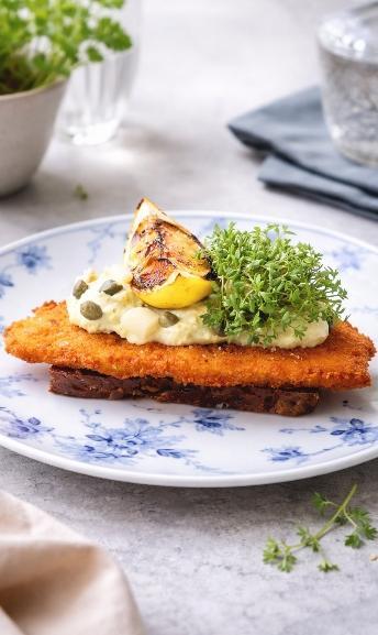 Paneret Dansk rødspættefilet, råsyltede agurker, remoulade, mayo, salat og MUMS kartoffel chips