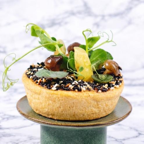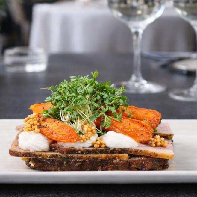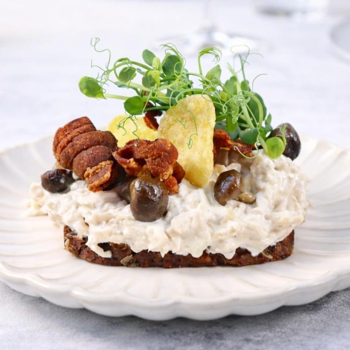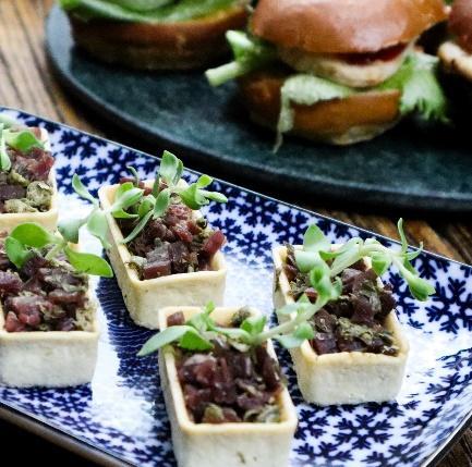 Røget Okseinderlår fra Krastrupsøgaard og kapers, med bruchetta creme serveret i smørbagt tærteform.