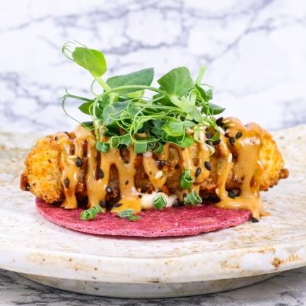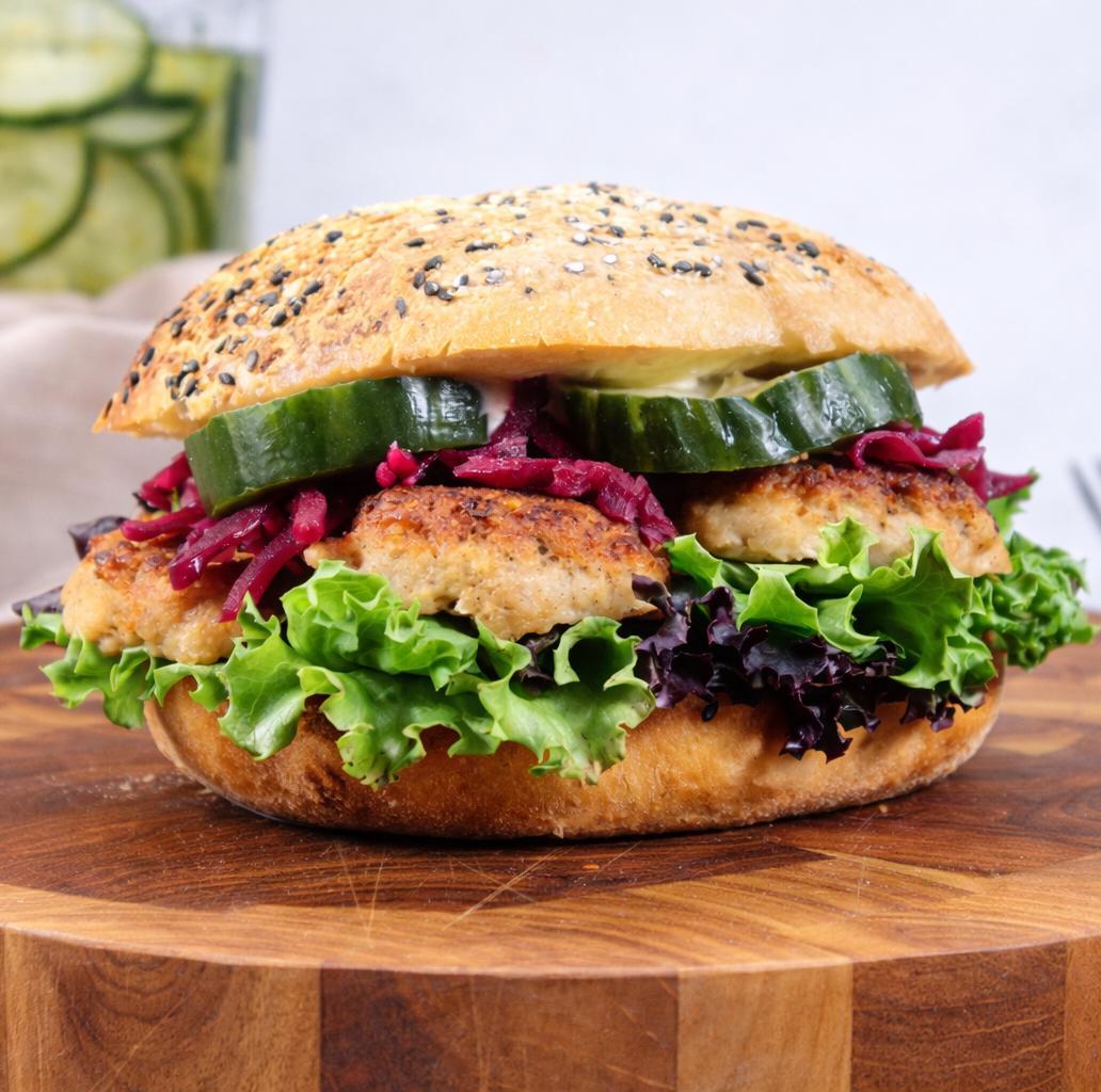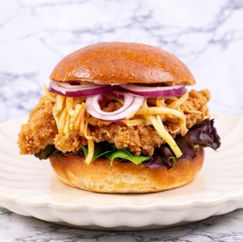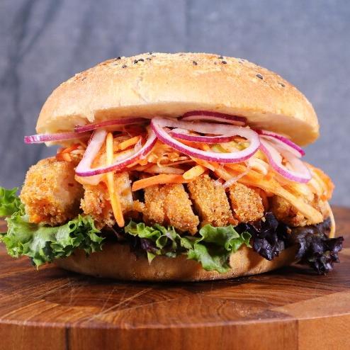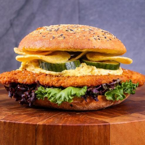 Sprød paneret kyllingefilet med hjemmelavet Kimchi slaw, rødløg, hvidløgs mayo og salat