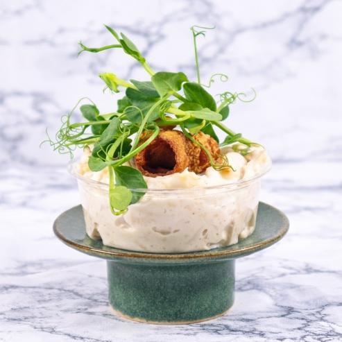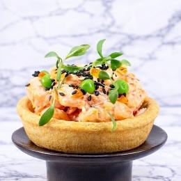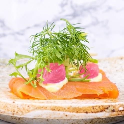 Koldrøget laks, med dild mayo og perleløg serveret i tærteform