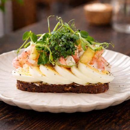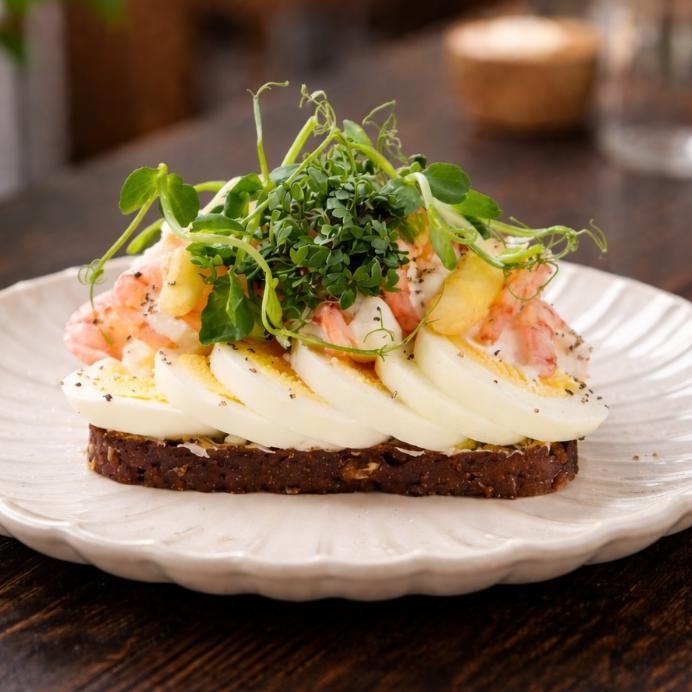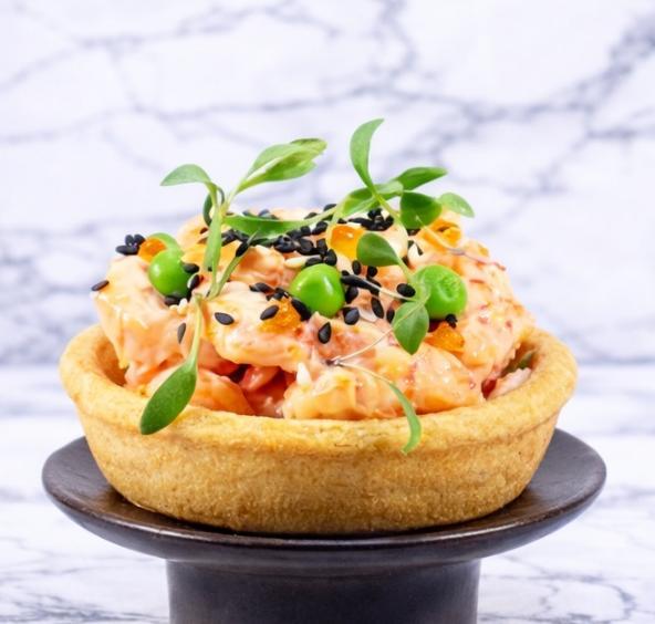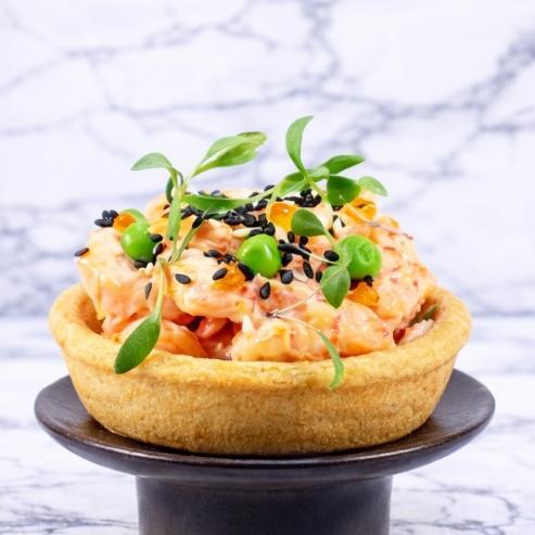 Grønlandske rejer med dild mayo og citronstøv serveret i tærteform