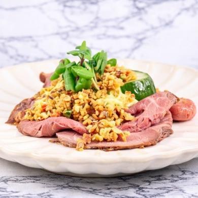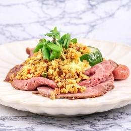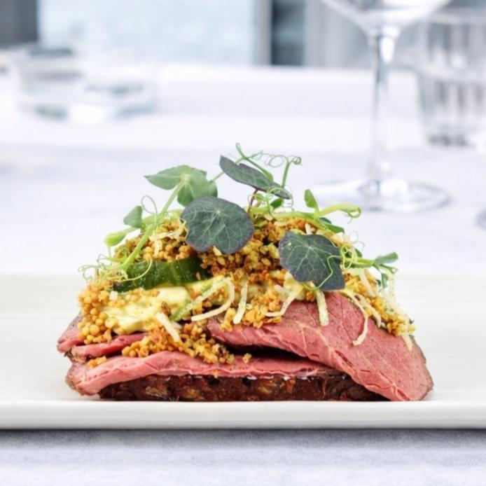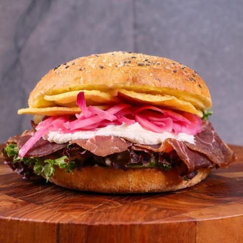 Røget okseinderlår, MUMS kartoffel chips, mayo, salat, hjemmesyltet syltede rødløg og peberrodscreme